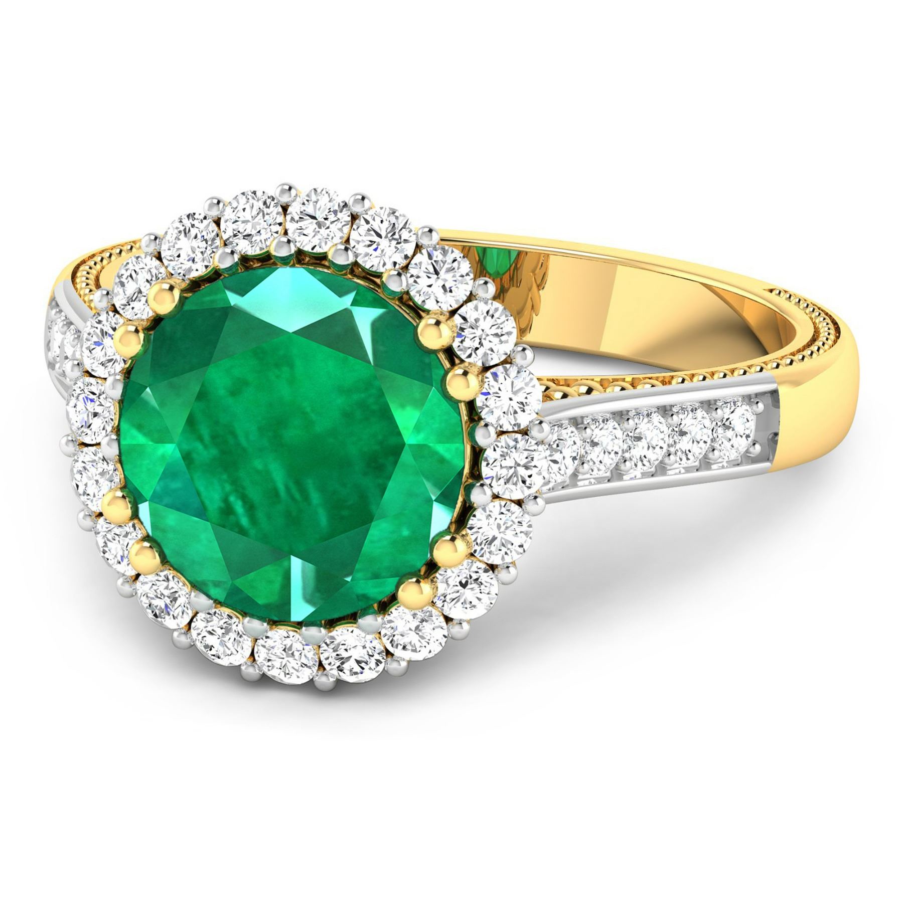 Zambian Emerald (AA) Round 9.00mm - 1Pc + White Diamond F/C Round 1.90mm - 4Pcs + White Diamond F/C Round 1.60mm - 16Pcs + White Diamond F/C Round 1.40mm - 10Pcs ( White Pan Rhodium ) ( SI-2/HI ) Total weight of gemstone is 2.75cts. Total Diamond weight is 0.54cts. Total weight of this ring is 4.14 grams. Ring size 7.