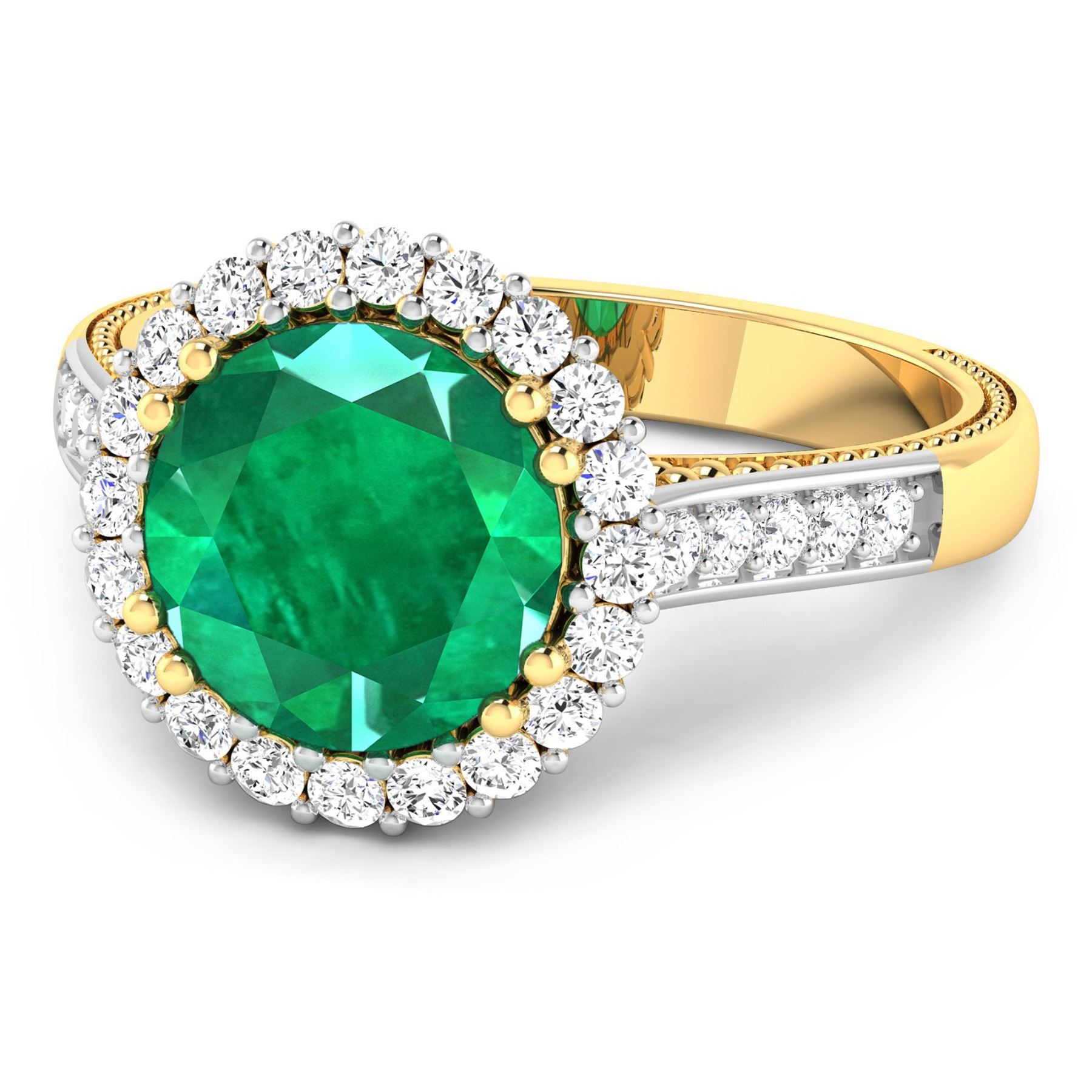 Zambian Emerald (AA) Round 9.00mm - 1Pc + White Diamond F/C Round 1.90mm - 4Pcs + White Diamond F/C Round 1.60mm - 16Pcs + White Diamond F/C Round 1.40mm - 10Pcs ( White Pan Rhodium ) ( SI-2/HI ) Total weight of gemstone is 2.75cts. Total Diamond weight is 0.54cts. Total weight of this ring is 4.14 grams. Ring size 7.