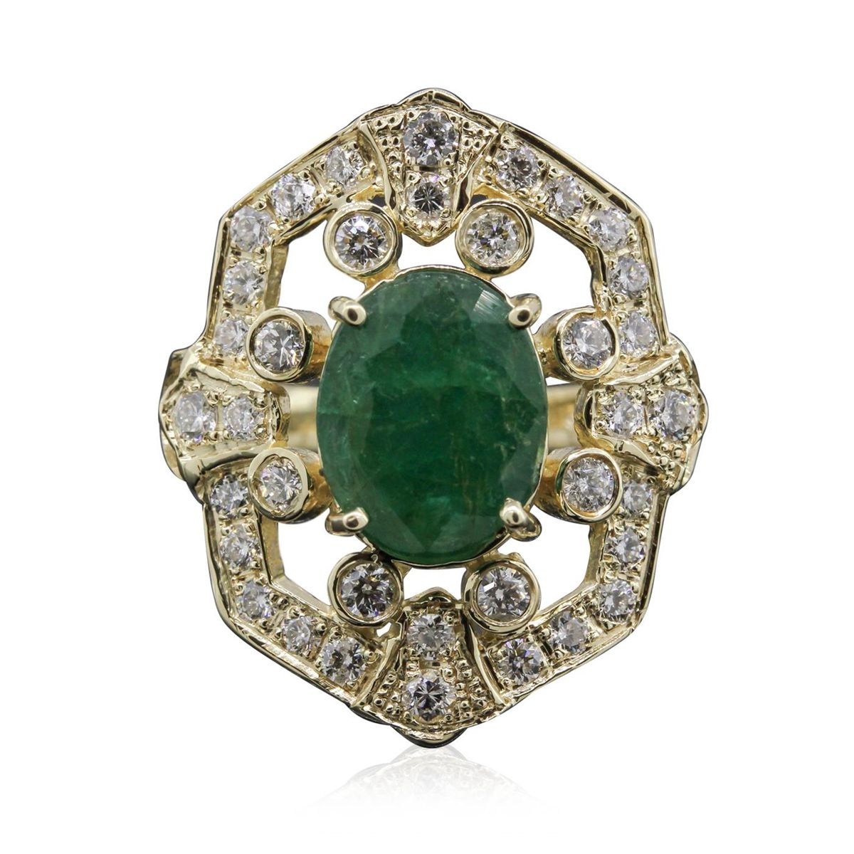 One electronically tested 14KT yellow gold Ladies combination cast & assembled fancy ring with a high polish finish. Condition is new. Identified with markings of "14K". Containing: One prong set oval modified brilliant cut natural emerald, measuring 11.20 x 9.00 x 5.00mm, approximate weight of 2.77ct., clarity is heavily included, type III, medium dark, moderately strong, green color, (GIA G 6/4), cut is good. Colored gemstones are presumed to have been subjected to commonly used and possible undetectable color/clarity enhancement processes. Eight bezel set round brilliant cut diamonds, measuring 2.50 - 2.50 x 1.66mm (depth est.) approximate total weight of 8 Stones = 0.51ct. Clarity of SI-2 to I-1, Color of H - I, Cut is Good. Thirty bead set round brilliant cut diamonds, measuring 2.10 - 1.70 x 1.14mm (depth est.) approximate total weight of 30 Stones = 0.75ct. Clarity of SI-2 to I-1, Color of H - I, Cut is Good. Total Weight of Colored Stones 2.77ct. Total Weight of Diamonds 1.26ct. Total Weight of Ring 7.60 grams. GGL Appraised at $11,040.00.