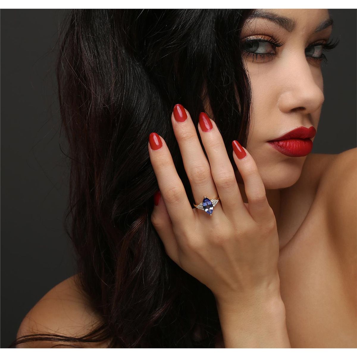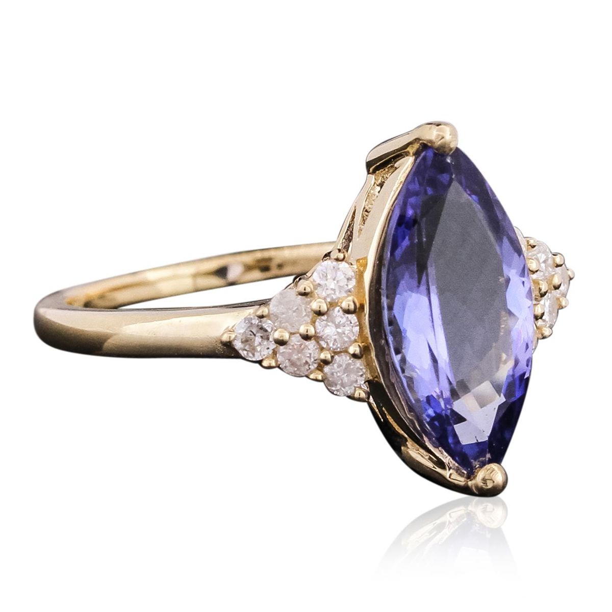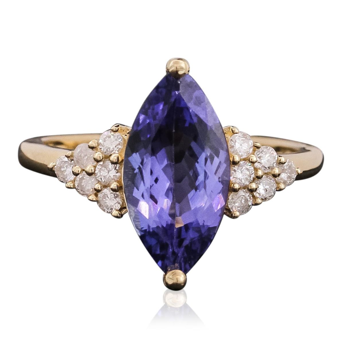 One electronically tested 14KT yellow gold ladies cast tanzanite and diamond ring with a bright polish finish. The featured tanzanite is supported by diamond set shoulders, completed by a one and one-half millimeter wide band. Trademark is Orianne. Identified with markings of "14K". Condition is new, good workmanship. Containing: One prong set marquise mixed cut natural tanzanite, measuring 14.00 x 7.00 x 4.20mm, 6% bulge factor, approximate weight of 2.78ct., clarity is eye clean, type I, medium dark, very slightly grayish, bluish violet color, (GIA bV 6/3), cut is good. Transmitting light with no distortion, transparent. Graded in the setting. Tanzanite is a very rare gemstone that is only found in the country of Tanzania. Originally discovered in 1967. Tiffany & Company, named the stone Tanzanite. It is found in the Usumburu Mountains that border the Umba Valley of northern Tanzania. Tanzanite occurs in gray, brown, violet, blue, reddish-purple, & green. The gem is interesting because of its exceptional pleochroism. Rotated in different directions a tanzanite will exhibit multiple changes of color. Tanzanite has a low tolerance to ultrasonic cleaning, and should not be cleaned using this method. Twelve prong set round brilliant cut diamonds, measuring 1.90 - 1.80 x 1.11mm (depth est.) approximate total weight of 12 Stones = 0.37ct. Graded in the setting. Clarity: I-1 to I-2. Color: G - I. Total Weight of Colored Stones 2.78ct. Total Weight of Diamonds 0.37ct. Total Weight of Ring 3.13 grams. AIG Appraised at $7,545.00.