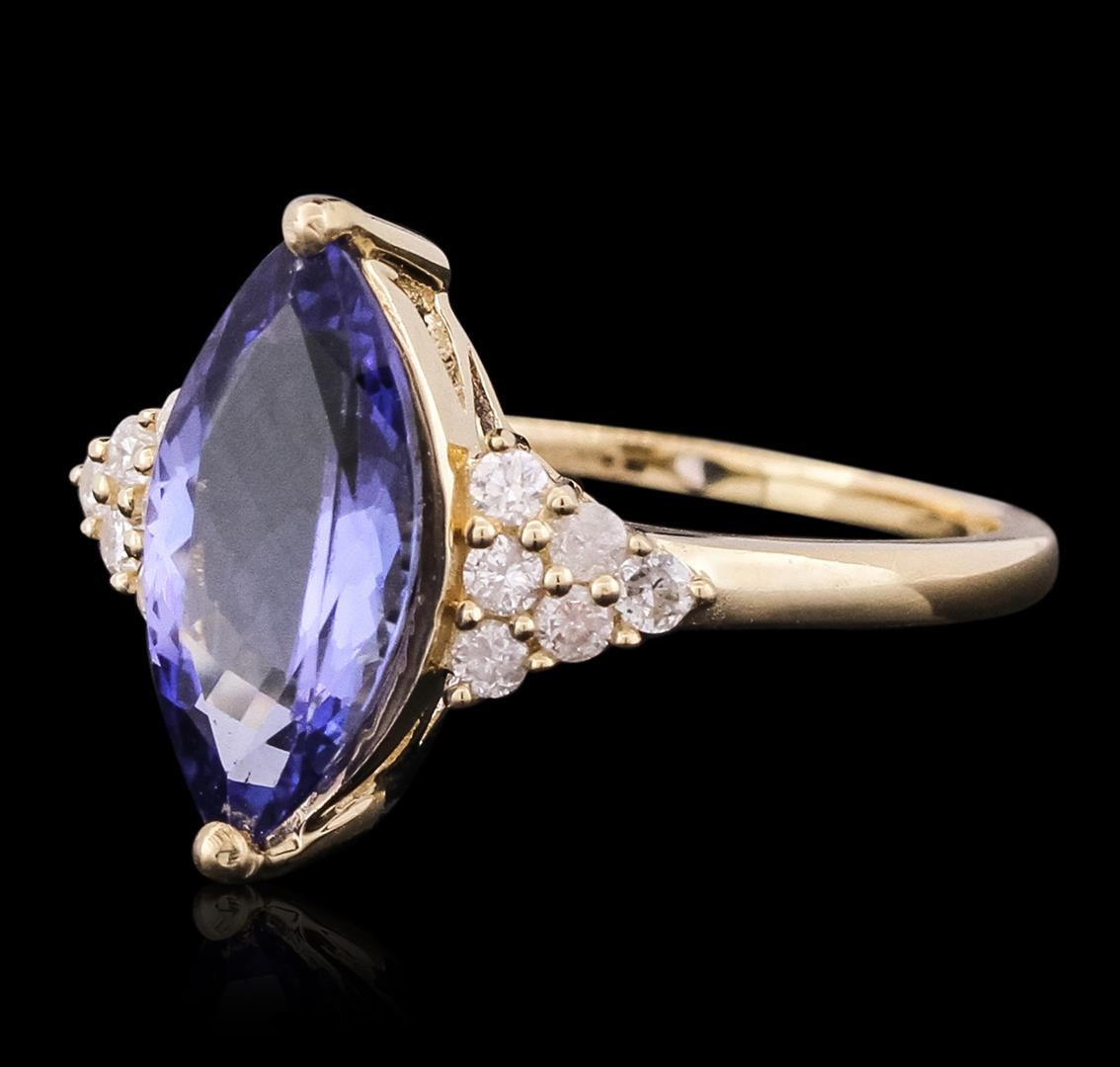 One electronically tested 14KT yellow gold ladies cast tanzanite and diamond ring with a bright polish finish. The featured tanzanite is supported by diamond set shoulders, completed by a one and one-half millimeter wide band. Trademark is Orianne. Identified with markings of "14K". Condition is new, good workmanship. Containing: One prong set marquise mixed cut natural tanzanite, measuring 14.00 x 7.00 x 4.20mm, 6% bulge factor, approximate weight of 2.78ct., clarity is eye clean, type I, medium dark, very slightly grayish, bluish violet color, (GIA bV 6/3), cut is good. Transmitting light with no distortion, transparent. Graded in the setting. Tanzanite is a very rare gemstone that is only found in the country of Tanzania. Originally discovered in 1967. Tiffany & Company, named the stone Tanzanite. It is found in the Usumburu Mountains that border the Umba Valley of northern Tanzania. Tanzanite occurs in gray, brown, violet, blue, reddish-purple, & green. The gem is interesting because of its exceptional pleochroism. Rotated in different directions a tanzanite will exhibit multiple changes of color. Tanzanite has a low tolerance to ultrasonic cleaning, and should not be cleaned using this method. Twelve prong set round brilliant cut diamonds, measuring 1.90 - 1.80 x 1.11mm (depth est.) approximate total weight of 12 Stones = 0.37ct. Graded in the setting. Clarity: I-1 to I-2. Color: G - I. Total Weight of Colored Stones 2.78ct. Total Weight of Diamonds 0.37ct. Total Weight of Ring 3.13 grams. AIG Appraised at $7,545.00.