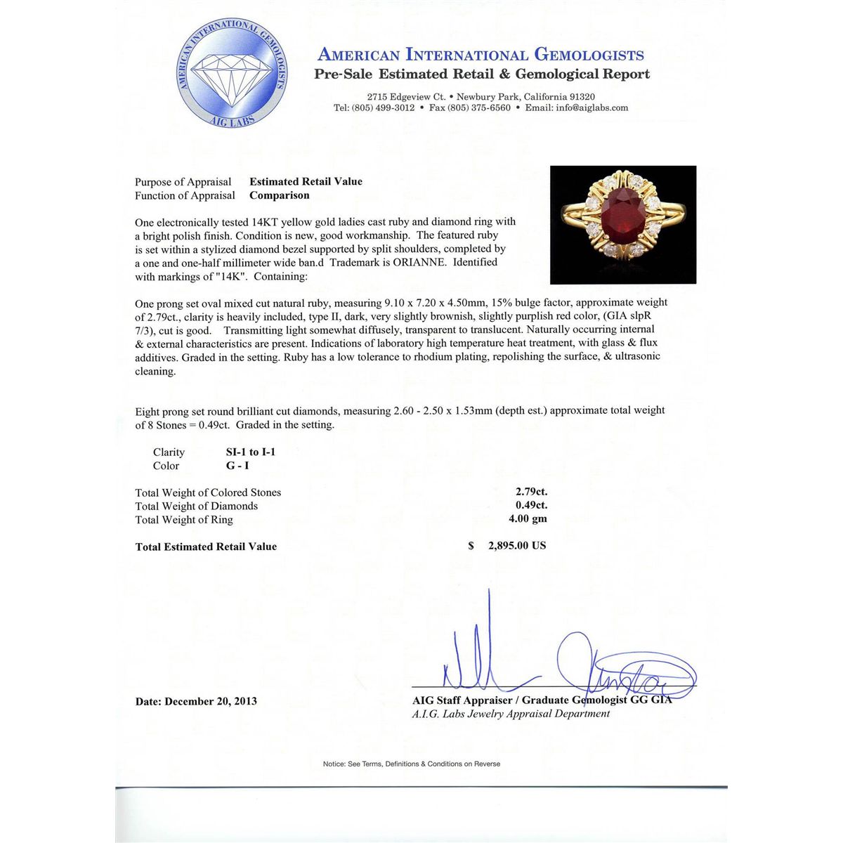 14KT yellow gold 2.79ct Ruby and Diamond Ring A6577. One electronically tested 14KT yellow gold ladies cast ruby and diamond ring with a bright polish finish. The featured ruby is set within a stylized diamond bezel supported by split shoulders, completed by a one and one-half millimeter wide ban.d Trademark is ORIANNE. Identified with markings of "14K". Condition is new, good workmanship. Containing: One prong set oval mixed cut natural ruby, measuring 9.10 x 7.20 x 4.50mm, 15%. bulge factor, approximate weight of 2.79ct., clarity is heavily included, type II, dark, very slightly brownish, slightly purplish red color, (GIA slpR 7/3), cut is good. Transmitting light somewhat diffusely, transparent to translucent. Naturally occurring internal & external characteristics are present. Indications of laboratory high temperature heat treatment, with glass & flux additives. Graded in the setting. Ruby has a low tolerance to rhodium plating, repolishing the surface, & ultrasonic cleaning.Eight prong set round brilliant cut diamonds, measuring 2.60 - 2.50 x 1.53mm (depth est.) approximate. Total Weight of 8 Stones = 0.49ct. Graded in the setting. Clarity: SI-1 to I-1. Color: G - I. Total Weight of Colored Stones 2.79ct. Total Weight of Diamonds 0.49ct. AIG Appraised at $2,895.00.