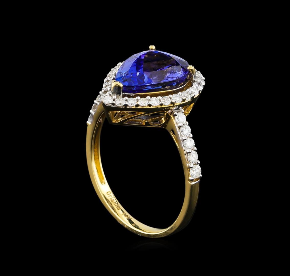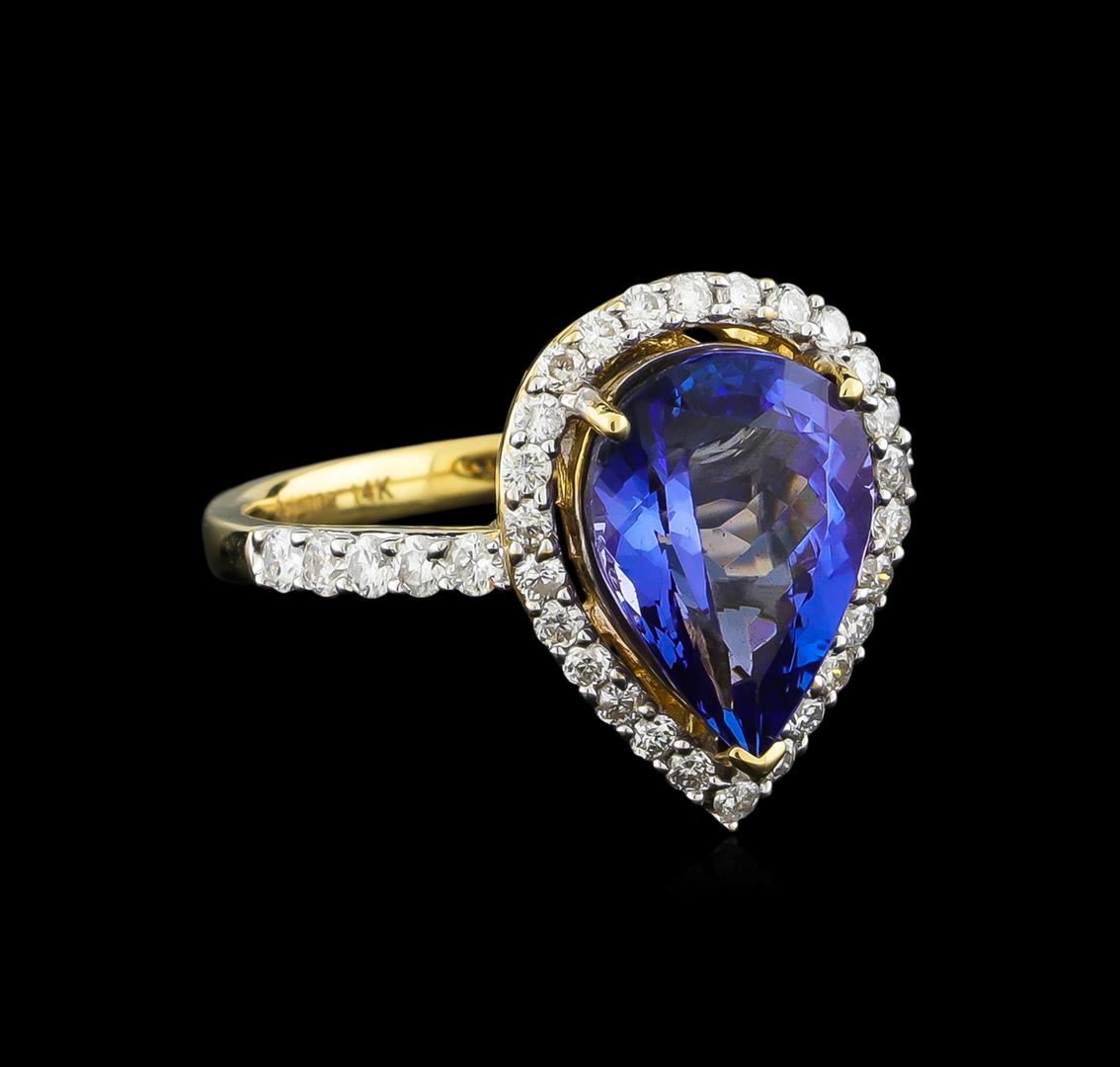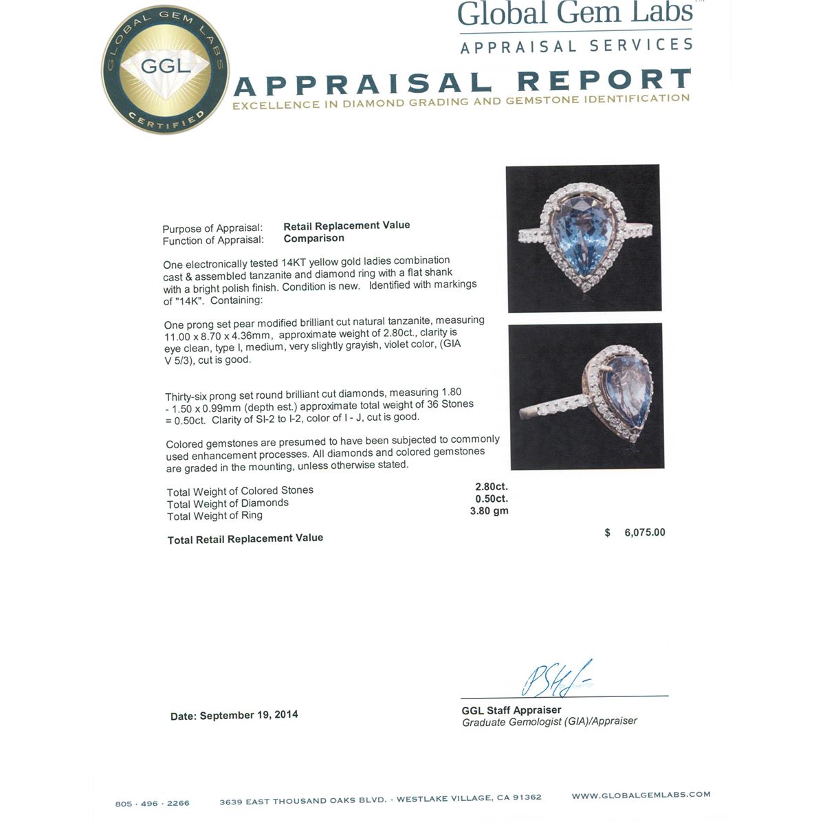 One electronically tested 14KT yellow gold ladies combination cast & assembled tanzanite and diamond ring with a flat shank with a bright polish finish. Identified with markings of "14K". Condition is new. Containing: One prong set pear modified brilliant cut natural tanzanite, measuring 11.00 x 8.70 x 4.36mm, approximate weight of 2.80ct., clarity is eye clean, type I, medium, very slightly grayish, violet color, (GIA V 5/3), cut is good. Thirty-Six prong set round brilliant cut diamonds, measuring 1.80 - 1.50 x 0.99mm (depth est.) approximate total weight of 36 Stones = 0.50ct. Clarity: SI-2 to I-2. Color: I - J, Cut is Good. Colored gemstones are presumed to have been subjected to commonly used enhancement processes. All diamonds and colored gemstones are graded in the mounting, unless otherwise stated. Total Weight of Colored Stones 2.80ct. Total Weight of Diamonds 0.50ct. Total Weight of Ring 3.80 grams. GGL Appraised at $6,075.00.
