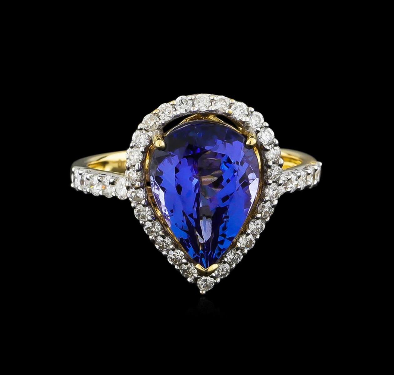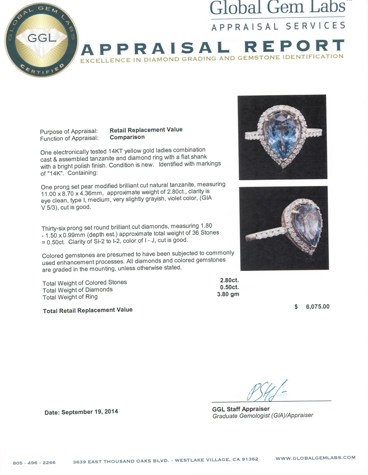 One electronically tested 14KT yellow gold ladies combination cast & assembled tanzanite and diamond ring with a flat shank with a bright polish finish. Identified with markings of "14K". Condition is new. Containing: One prong set pear modified brilliant cut natural tanzanite, measuring 11.00 x 8.70 x 4.36mm, approximate weight of 2.80 ct., clarity is eye clean, type I, medium, very slightly grayish, violet color, (GIA V 5/3), cut is good. Thirty-Six prong set round brilliant cut diamonds, measuring 1.80 - 1.50 x 0.99mm (depth est.) approximate total weight of 36 Stones = 0.50 ct. Clarity: SI-2 to I-2. Color: I - J, Cut is Good. Colored gemstones are presumed to have been subjected to commonly used enhancement processes. All diamonds and colored gemstones are graded in the mounting, unless otherwise stated. Total Weight of Colored Stones 2.80 ct. Total Weight of Diamonds 0.50 ct. Total Weight of Ring 3.80 grams. GGL Appraised.