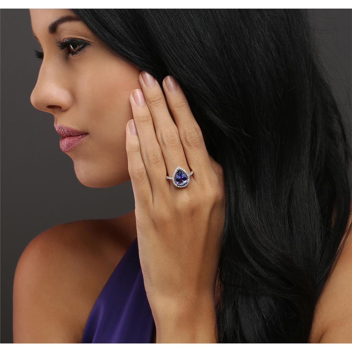 One electronically tested 14KT yellow gold ladies combination cast & assembled tanzanite and diamond ring with a flat shank with a bright polish finish. Identified with markings of "14K". Condition is new. Containing: One prong set pear modified brilliant cut natural tanzanite, measuring 11.00 x 8.70 x 4.36mm, approximate weight of 2.80ct., clarity is eye clean, type I, medium, very slightly grayish, violet color, (GIA V 5/3), cut is good. Thirty-Six prong set round brilliant cut diamonds, measuring 1.80 - 1.50 x 0.99mm (depth est.) approximate total weight of 36 Stones = 0.50ct. Clarity: SI-2 to I-2. Color: I - J, Cut is Good. Colored gemstones are presumed to have been subjected to commonly used enhancement processes. All diamonds and colored gemstones are graded in the mounting, unless otherwise stated. Total Weight of Colored Stones 2.80ct. Total Weight of Diamonds 0.50ct. Total Weight of Ring 3.80 grams. GGL Appraised at $6,075.00. AIGAppraised at $45,900.00.