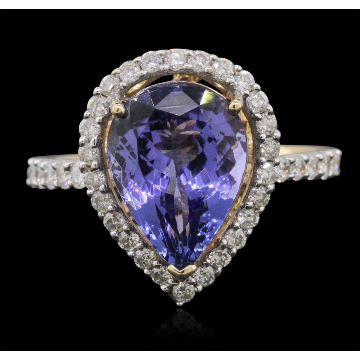 One electronically tested 14KT yellow gold ladies combination cast & assembled tanzanite and diamond ring with a flat shank with a bright polish finish. Identified with markings of "14K". Condition is new. Containing: One prong set pear modified brilliant cut natural tanzanite, measuring 11.00 x 8.70 x 4.36mm, approximate weight of 2.80ct., clarity is eye clean, type I, medium, very slightly grayish, violet color, (GIA V 5/3), cut is good. Thirty-Six prong set round brilliant cut diamonds, measuring 1.80 - 1.50 x 0.99mm (depth est.) approximate total weight of 36 Stones = 0.50ct. Clarity: SI-2 to I-2. Color: I - J, Cut is Good. Colored gemstones are presumed to have been subjected to commonly used enhancement processes. All diamonds and colored gemstones are graded in the mounting, unless otherwise stated. Total Weight of Colored Stones 2.80ct. Total Weight of Diamonds 0.50ct. Total Weight of Ring 3.80 grams. GGL Appraised at $6,075.00.