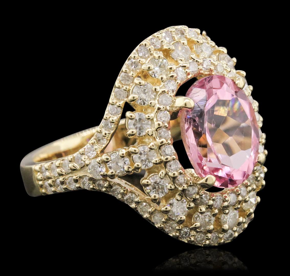 One electronically tested 14KT yellow gold ladies combination cast & assembled ring with a bright polish finish. Condition is new. Identified with markings of "K14". Containing: One prong set oval modified brilliant cut natural kunzite, measuring 10.00 x 8.00 x 5.45mm, approximate weight of 2.81ct., clarity is eye clean, type I, light, very slightly grayish, reddish purple color, (GIA rP 3/3), cut is good. Twenty-Four prong set round brilliant cut diamonds, measuring 1.10 - 1.10 x 0.66mm (depth est.) approximate. Total Weight of 24 Stones = 0.12ct. Clarity: I-1 to I-2. Color: I - J, Cut is Good. Seventy-Six prong set round brilliant cut diamonds, measuring 2.20 - 1.30 x 1.05mm (depth est.) approximate. Total Weight of 76 Stones = 0.99ct. Clarity: I-1 to I-2. Color: I - J, Cut is Good. Colored gemstones are presumed to have been subjected to commonly used enhancement processes. All diamonds and colored gemstones are graded in the mounting, unless otherwise stated. Total Weight of Colored Stones 2.81ct. Total Weight of Diamonds 1.11ct. Total Weight of Ring 7.70 grams. GGL Appraised at $6,610.00.