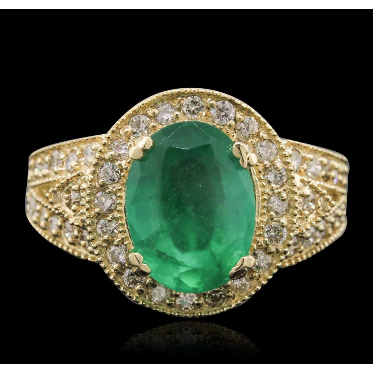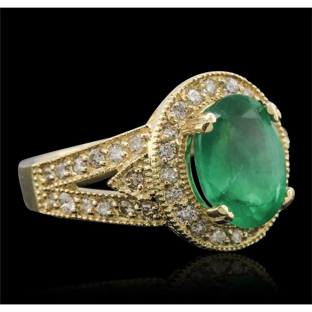 One electronically tested 14KT yellow gold Ladies combination cast & assembled ring with a bright polish finish. Condition is new. Identified with markings of "K14". Containing: One prong set oval modified brilliant cut natural emerald, measuring 11.34 x 8.58 x 5.20mm, approximate weight of 2.81ct., clarity is moderately included, type III, medium, moderately strong, green color, (GIA G 5/4), cut is good. Colored gemstones are presumed to have been subjected to commonly used color/clarity enhancement processes. Forty-Six prong set round brilliant cut diamonds, measuring 1.40 - 1.40 x 0.84mm (depth est.) approximate. Total Weight of 46 Stones = 0.46ct. Clarity: I-1 to I-2. Color: J - K, Cut is Good. Total Weight of Colored Stones 2.81ct. Total Weight of Diamonds 0.46ct. Total Weight of Ring 7.50 grams. GGL Appraised at $7,670.00.