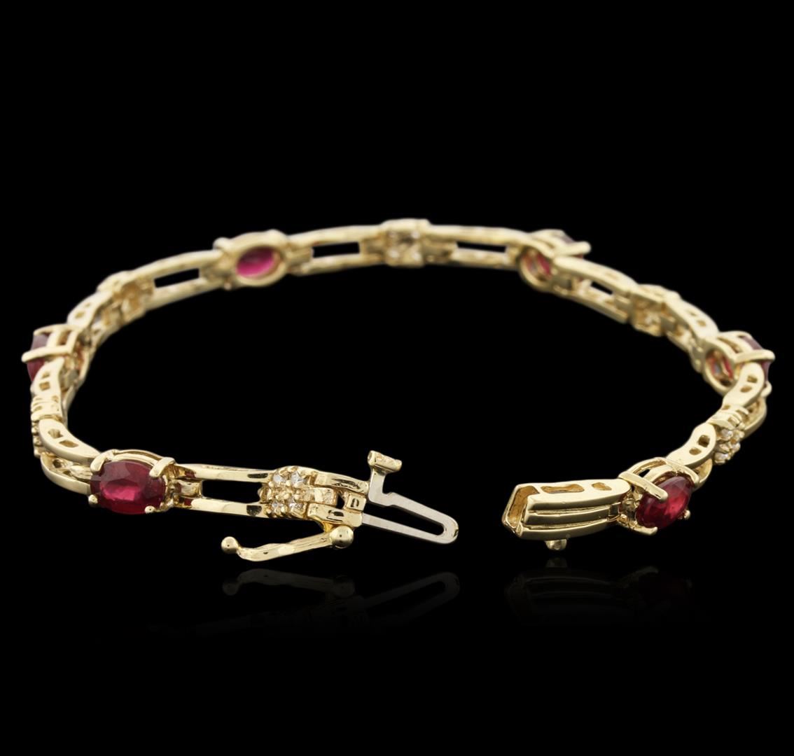 One electronically tested 14KT yellow gold ladies cast ruby and diamond bracelet with a hidden box clasp with safety closer with a bright polish finish. Measurements: 6.50" in length Identified with markings of "14K". Condition is new. Containing: Six prong set oval modified brilliant cut natural rubies, measuring 6.00. x 3.80 x 2.47mm, approximate total weight of 2.82ct., clarity is moderately included, type II, medium dark, moderately strong, red color, (GIA R 6/4), cut is good. Twenty-Four prong set round brilliant cut diamonds, measuring 1.30 - 1.30 x 0.78mm (depth est.) approximate total weight of 24 Stones = 0.19ct. Clarity: SI-1 to SI-2. Color: I - J, Cut is Good. Colored gemstones are presumed to have been subjected to commonly used enhancement processes. All diamonds and colored gemstones are graded in the mounting, unless otherwise stated. Total Weight of Colored Stones 2.82ct. Total Weight of Diamonds 0.19ct. Total Weight of Bracelet 9.80 grams. GGL Appraised at $2,420.00.