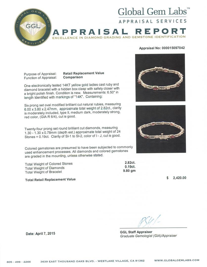 One electronically tested 14KT yellow gold ladies cast ruby and diamond bracelet with a hidden box clasp with safety closer with a bright polish finish. Measurements: 6.50" in length Identified with markings of "14K". Condition is new. Containing: Six prong set oval modified brilliant cut natural rubies, measuring 6.00. x 3.80 x 2.47mm, approximate total weight of 2.82ct., clarity is moderately included, type II, medium dark, moderately strong, red color, (GIA R 6/4), cut is good. Twenty-Four prong set round brilliant cut diamonds, measuring 1.30 - 1.30 x 0.78mm (depth est.) approximate total weight of 24 Stones = 0.19ct. Clarity: SI-1 to SI-2. Color: I - J, Cut is Good. Colored gemstones are presumed to have been subjected to commonly used enhancement processes. All diamonds and colored gemstones are graded in the mounting, unless otherwise stated. Total Weight of Colored Stones 2.82ct. Total Weight of Diamonds 0.19ct. Total Weight of Bracelet 9.80 grams. GGL Appraised at $2,420.00.