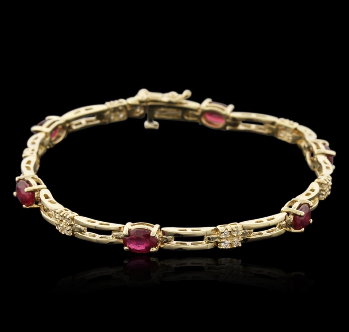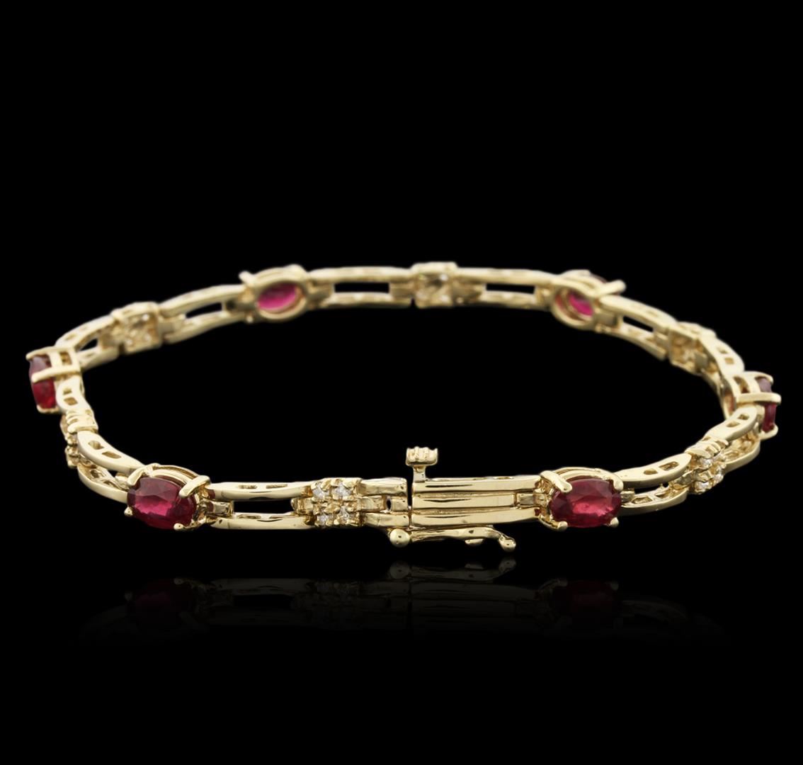 One electronically tested 14KT yellow gold ladies cast ruby and diamond bracelet with a hidden box clasp with safety closer with a bright polish finish. Measurements: 6.50" in length Identified with markings of "14K". Condition is new. Containing: Six prong set oval modified brilliant cut natural rubies, measuring 6.00. x 3.80 x 2.47mm, approximate total weight of 2.82ct., clarity is moderately included, type II, medium dark, moderately strong, red color, (GIA R 6/4), cut is good. Twenty-Four prong set round brilliant cut diamonds, measuring 1.30 - 1.30 x 0.78mm (depth est.) approximate total weight of 24 Stones = 0.19ct. Clarity: SI-1 to SI-2. Color: I - J, Cut is Good. Colored gemstones are presumed to have been subjected to commonly used enhancement processes. All diamonds and colored gemstones are graded in the mounting, unless otherwise stated. Total Weight of Colored Stones 2.82ct. Total Weight of Diamonds 0.19ct. Total Weight of Bracelet 9.80 grams. GGL Appraised at $2,420.00.