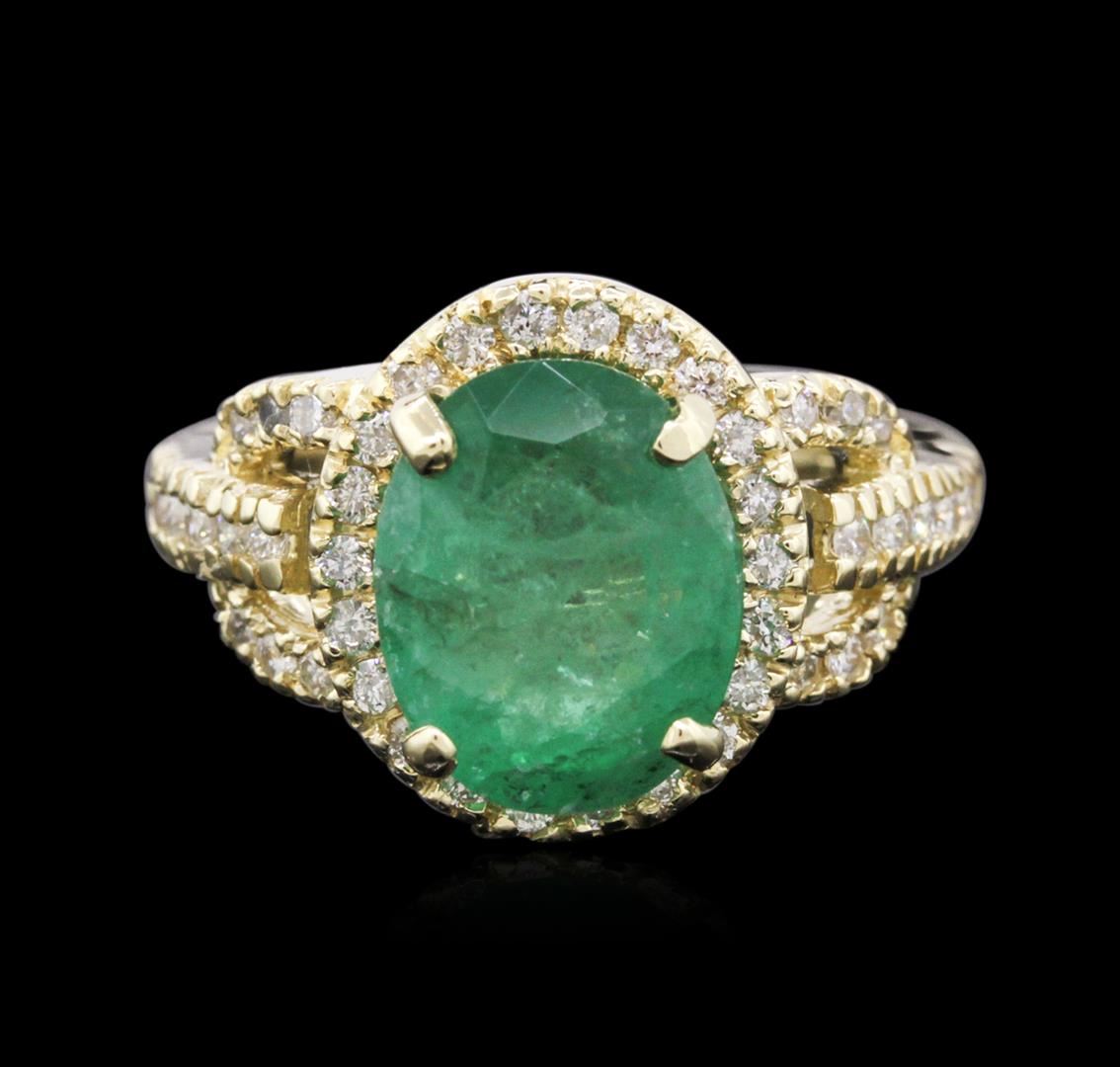 One electronically tested 14KT yellow gold ladies cast emerald and diamond ring with a bright polish finish. Identified with markings of "K14". Condition is new. Containing: One prong set oval modified brilliant cut natural emerald, measuring 12.00 x 9.10 x 4.55mm, approximate weight of 2.84ct., clarity is moderately included, type III, medium light, very slightly grayish, green color, (GIA G 4/3), cut is good. Forty-Six prong set round brilliant cut diamonds, measuring 1.50 - 1.50 x 0.90mm (depth est.) approximate total weight of 46 Stones = 0.57ct. Clarity: SI-2 to I-1. Color: J - K, Cut is Good. Colored gemstones are presumed to have been subjected to commonly used enhancement processes. All diamonds and colored gemstones are graded in the mounting, unless otherwise stated. Total Weight of Colored Stones 2.84ct. Total Weight of Diamonds 0.57ct. Total Weight of Ring 7.00 grams. GGL Appraised at $4,250.00.