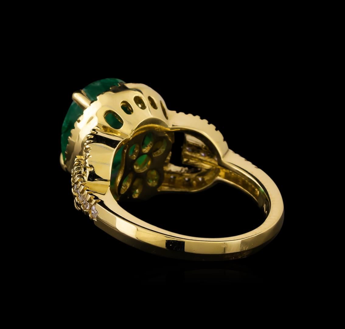 One electronically tested 14KT yellow gold ladies cast emerald and diamond ring with a bright polish finish. Identified with markings of "K14". Condition is new. Containing: One prong set oval modified brilliant cut natural emerald, measuring 12.00 x 9.10 x 4.55mm, approximate weight of 2.84ct., clarity is moderately included, type III, medium light, very slightly grayish, green color, (GIA G 4/3), cut is good. Forty-Six prong set round brilliant cut diamonds, measuring 1.50 - 1.50 x 0.90mm (depth est.) approximate total weight of 46 Stones = 0.57ct. Clarity: SI-2 to I-1. Color: J - K, Cut is Good. Colored gemstones are presumed to have been subjected to commonly used enhancement processes. All diamonds and colored gemstones are graded in the mounting, unless otherwise stated. Total Weight of Colored Stones 2.84ct. Total Weight of Diamonds 0.57ct. Total Weight of Ring 7.00 grams. GGL Appraised at $4,250.00.