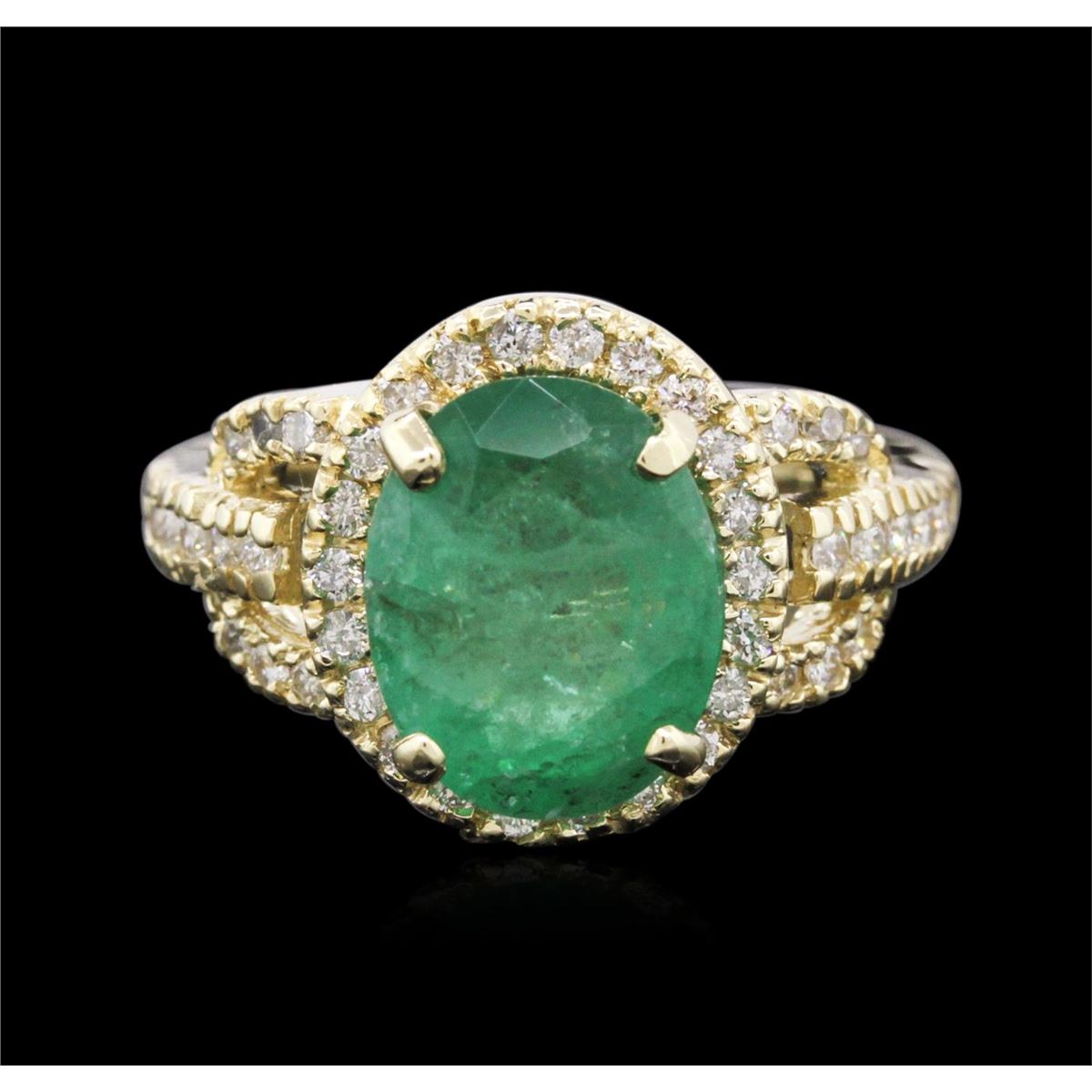 One electronically tested 14KT yellow gold ladies cast emerald and diamond ring with a bright polish finish. Identified with markings of "K14". Condition is new. Containing: One prong set oval modified brilliant cut natural emerald, measuring 12.00 x 9.10 x 4.55mm, approximate weight of 2.84ct., clarity is moderately included, type III, medium light, very slightly grayish, green color, (GIA G 4/3), cut is good. Forty-Six prong set round brilliant cut diamonds, measuring 1.50 - 1.50 x 0.90mm (depth est.) approximate total weight of 46 Stones = 0.57ct. Clarity: SI-2 to I-1. Color: J - K, Cut is Good. Colored gemstones are presumed to have been subjected to commonly used enhancement processes. All diamonds and colored gemstones are graded in the mounting, unless otherwise stated. Total Weight of Colored Stones 2.84ct. Total Weight of Diamonds 0.57ct. Total Weight of Ring 7.00 grams. GGL Appraised at $4,250.00.