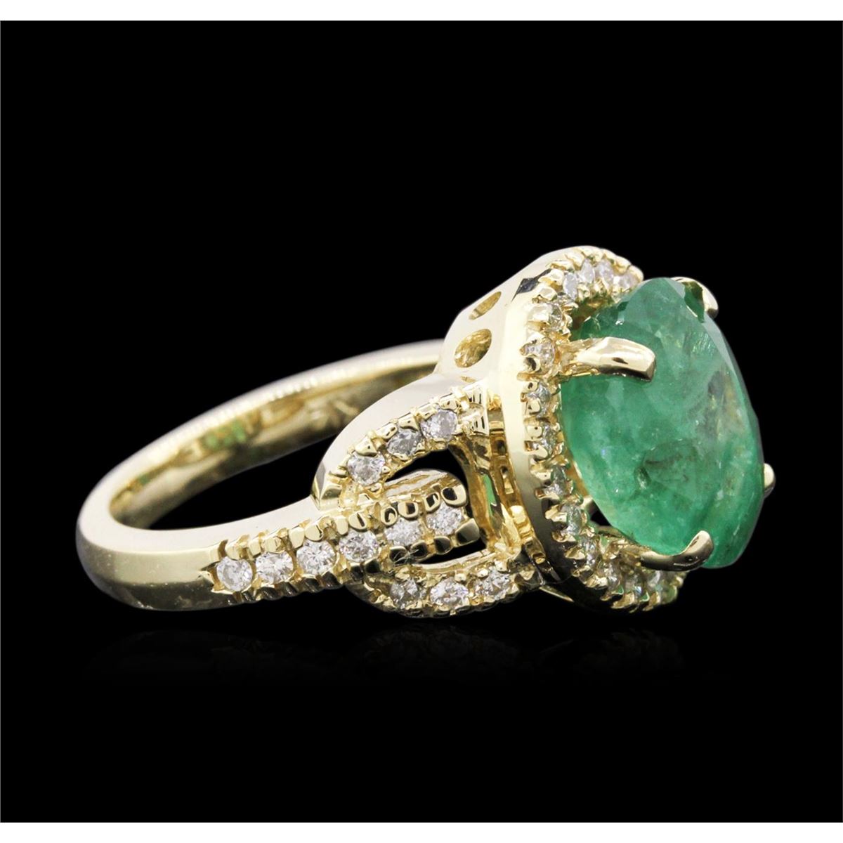 One electronically tested 14KT yellow gold ladies cast emerald and diamond ring with a bright polish finish. Identified with markings of "K14". Condition is new. Containing: One prong set oval modified brilliant cut natural emerald, measuring 12.00 x 9.10 x 4.55mm, approximate weight of 2.84ct., clarity is moderately included, type III, medium light, very slightly grayish, green color, (GIA G 4/3), cut is good. Forty-Six prong set round brilliant cut diamonds, measuring 1.50 - 1.50 x 0.90mm (depth est.) approximate total weight of 46 Stones = 0.57ct. Clarity: SI-2 to I-1. Color: J - K, Cut is Good. Colored gemstones are presumed to have been subjected to commonly used enhancement processes. All diamonds and colored gemstones are graded in the mounting, unless otherwise stated. Total Weight of Colored Stones 2.84ct. Total Weight of Diamonds 0.57ct. Total Weight of Ring 7.00 grams. GGL Appraised at $4,250.00.