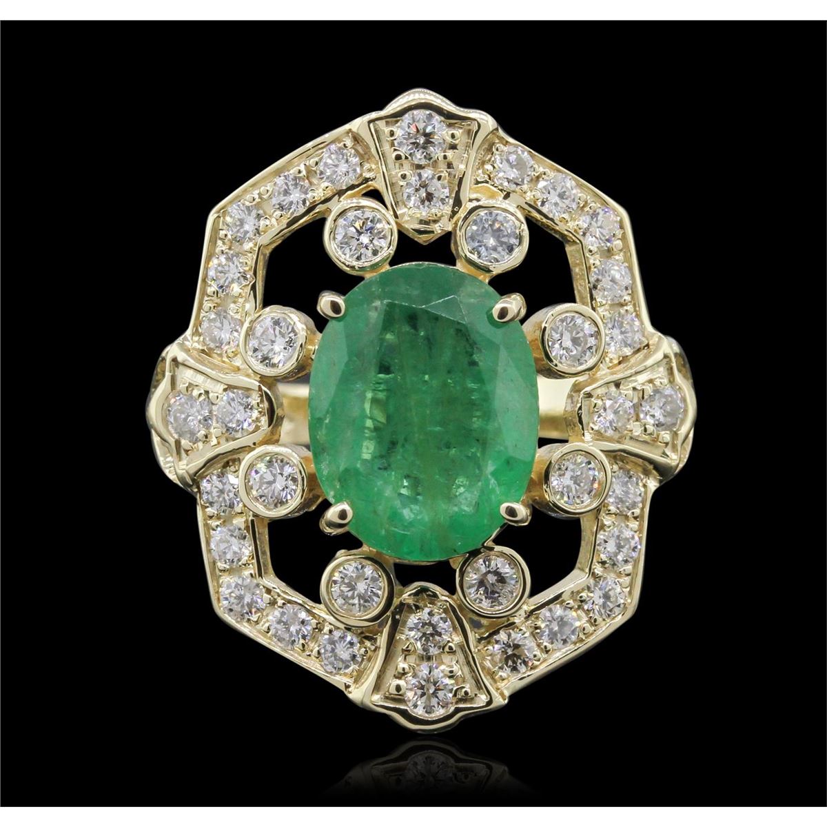 One electronically tested 14KT yellow gold Ladies combination cast & assembled fancy ring with a high polish finish. Condition is new. Identified with markings of "14K". Containing: One prong set oval modified brilliant cut natural emerald, measuring 11.70 x 9.20 x 4.80mm, approximate weight of 2.85ct., clarity is heavily included, type III, medium light, very slightly grayish, green color, (GIA G 4/3), cut is good. Colored gemstones are presumed to have been subjected to commonly used and possible undetectable color/clarity enhancement processes. Ten bezel set round brilliant cut diamonds, measuring 2.50 - 2.50 x 1.66mm (depth est.) approximate total weight of 10 Stones = 0.63ct. Clarity of SI-2 to I-1, Color of J - K, Cut is Good. Twenty-Seven bead set round brilliant cut diamonds, measuring 2.10 - 1.80 x 1.17mm (depth est.) approximate total weight of 27 Stones = 0.73ct. Clarity of SI-2 to I-1, Color of J - L, Cut is Good. Total Weight of Colored Stones 2.85ct. Total Weight of Diamonds 1.36ct. Total Weight of Ring 7.50 grams. GGL Appraised at $10,730.00.