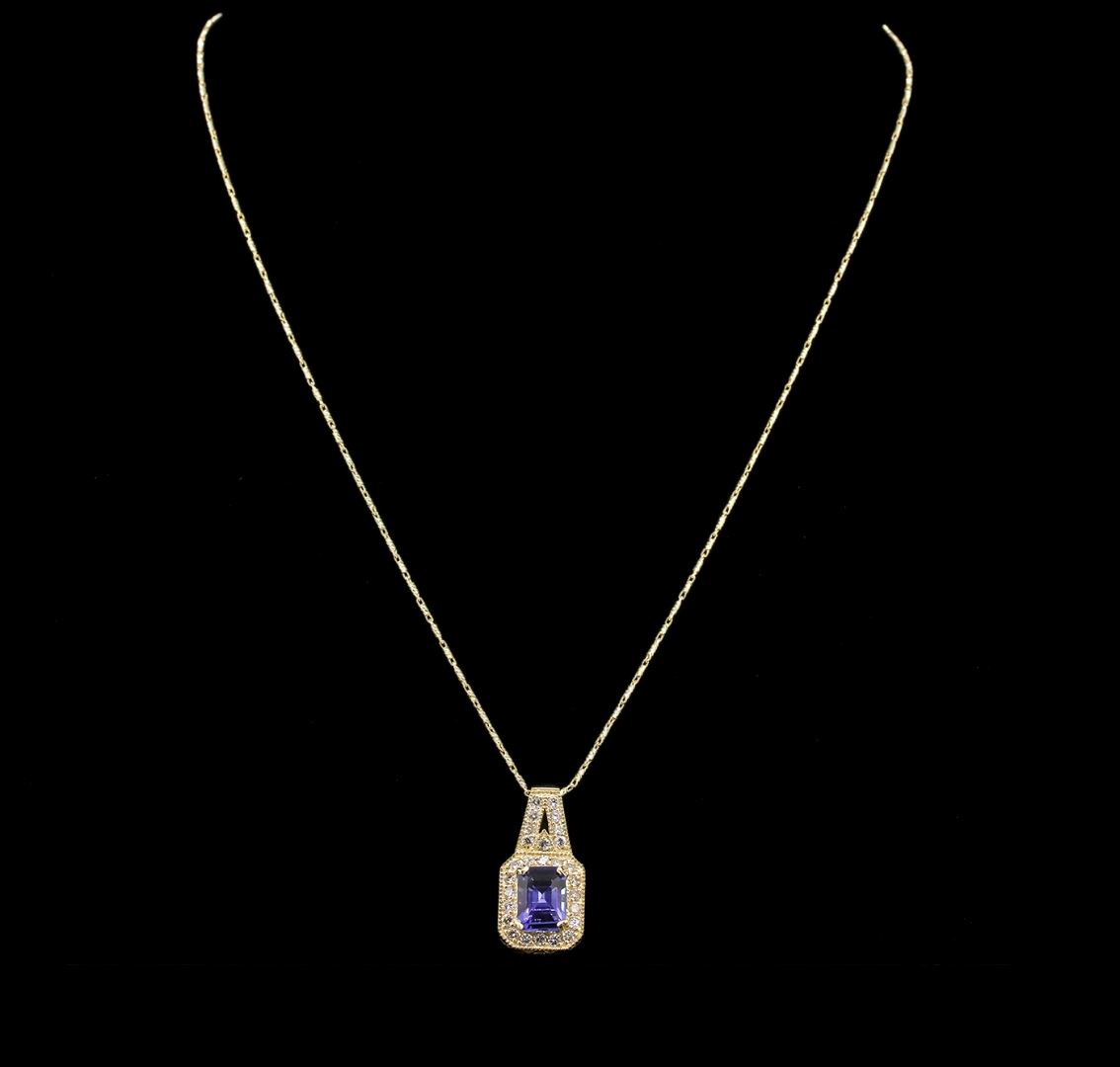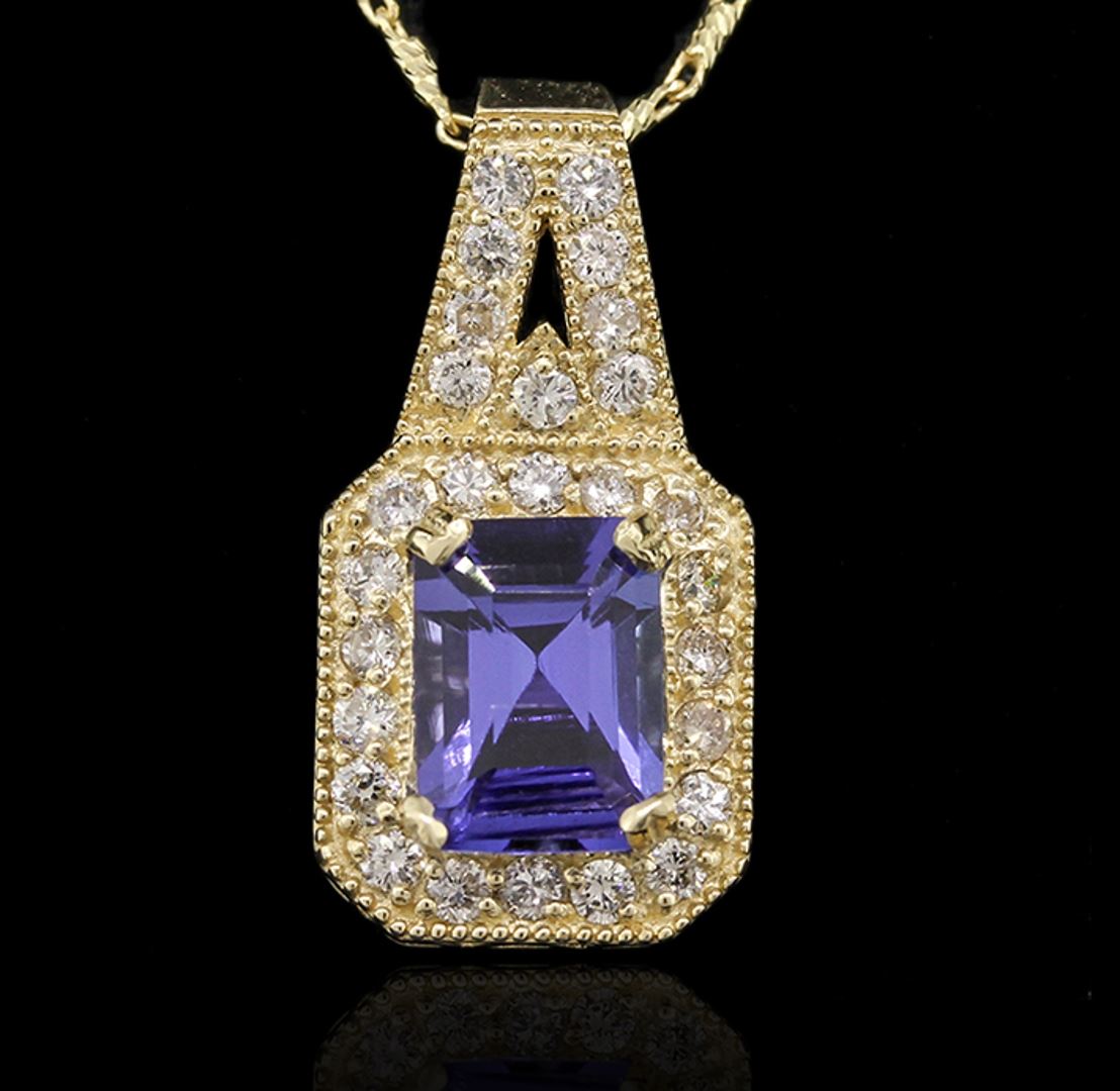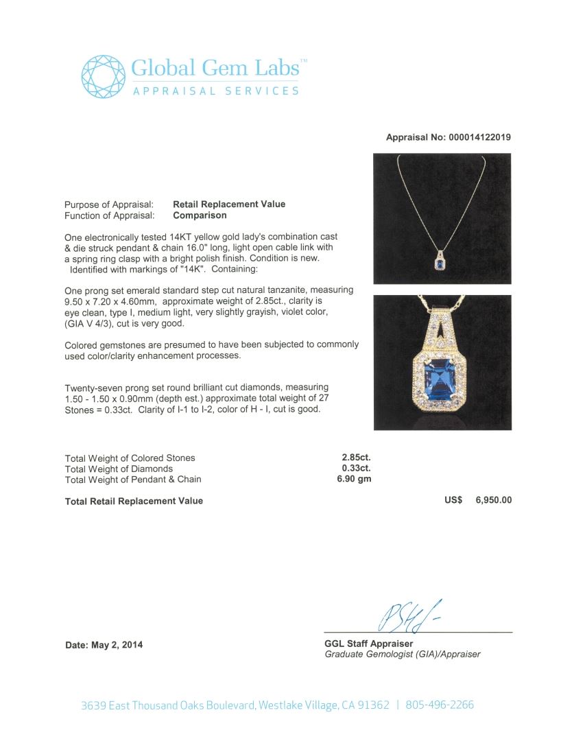 One electronically tested 14KT yellow gold Ladies combination cast & die struck pendant & chain 16.0" long, light open cable link with a spring ring clasp with a bright polish finish. Condition is new. Identified with markings of "14K". Containing: One prong set emerald standard step cut natural tanzanite, measuring 9.50 x 7.20 x 4.60mm, approximate weight of 2.85ct., clarity is eye clean, type I, medium light, very slightly grayish, violet color, (GIA V 4/3), cut is very good. Colored gemstones are presumed to have been subjected to commonly used color/clarity enhancement processes. Twenty-Seven prong set round brilliant cut diamonds, measuring 1.50 - 1.50 x 0.90mm (depth est.) approximate. Total Weight of 27 Stones = 0.33ct. Clarity: I-1 to I-2. Color: H - I, Cut is Good. Total Weight of Colored Stones 2.85ct. Total Weight of Diamonds 0.33ct. Total Weight of Pendant & Chain 6.90 grams. GGL Appraised at $6,950.00.