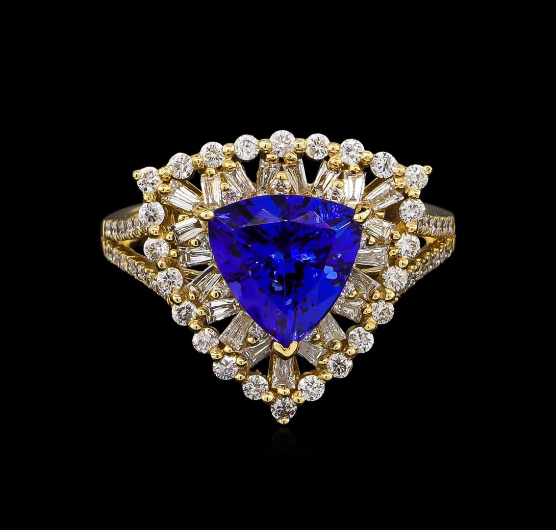 One electronically tested 14KT yellow gold Ladies combination cast & assembled ring with a bright polish finish. Identified with markings of "14K". Condition is new. Containing: Thirty-Seven prong set round brilliant cut diamonds, measuring 1.00 - 1.00 x 0.60mm (depth est.) approximate total weight of 37 Stones = 0.20ct. Clarity of I-1 to I-2, Color of H, Cut is Good. Twenty-Four prong set round brilliant cut diamonds, measuring 1.30 - 1.30 x 0.78mm (depth est.) approximate total weight of 24 Stones = 0.35ct. Clarity of I-1 to I-2, Color of H, Cut is Good. Nineteen prong set baguette cut diamonds, measuring 2.00 x 1.00 x 0.85mm (depth est.) approximate total weight of 19 Stones = 0.48ct. Clarity of SI-1 to SI-2, Color of J - K, Cut is Good. One prong set triangle modified brilliant cut natural tanzanite, measuring 9.00 x 9.00 x 5.85mm, approximate weight of 2.86ct., clarity is eye clean, type I, medium, moderately strong, blue color, (GIA B 5/4), cut is very good. Colored gemstones are presumed to have been subjected to commonly used color/clarity enhancement processes. Total Weight of Colored Stones 2.86ct. Total Weight of Diamonds 1.03ct. Total Weight of Ring 4.80 grams. GGL Appraised at $7,525.00.