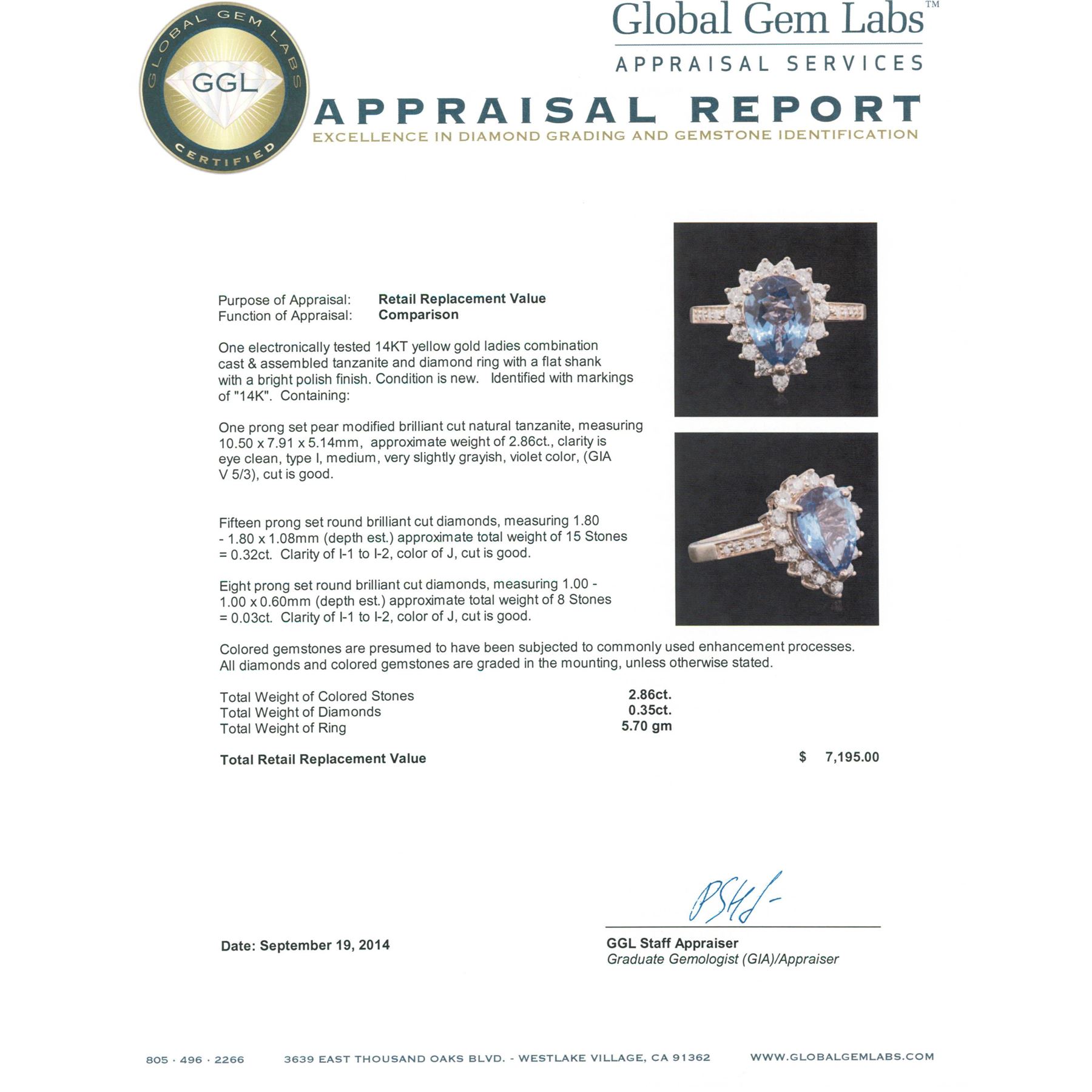 One electronically tested 14KT yellow gold ladies combination cast & assembled tanzanite and diamond ring with a flat shank with a bright polish finish. Identified with markings of "14K". Condition is new. Containing: One prong set pear modified brilliant cut natural tanzanite, measuring 10.50 x 7.91 x 5.14mm, approximate weight of 2.86ct., clarity is eye clean, type I, medium, very slightly grayish, violet color, (GIA V 5/3), cut is good. Fifteen prong set round brilliant cut diamonds, measuring 1.80 - 1.80 x 1.08mm (depth est.) approximate total weight of 15 Stones = 0.32ct. Clarity: I-1 to I-2. Color: J, Cut is Good. Eight prong set round brilliant cut diamonds, measuring 1.00 - 1.00 x 0.60mm (depth est.) approximate total weight of 8 Stones = 0.03ct. Clarity: I-1 to I-2. Color: J, Cut is Good. Colored gemstones are presumed to have been subjected to commonly used enhancement processes. All diamonds and colored gemstones are graded in the mounting, unless otherwise stated. Total Weight of Colored Stones 2.86ct. Total Weight of Diamonds 0.35ct. Total Weight of Ring 5.70 grams. GGL Appraised.