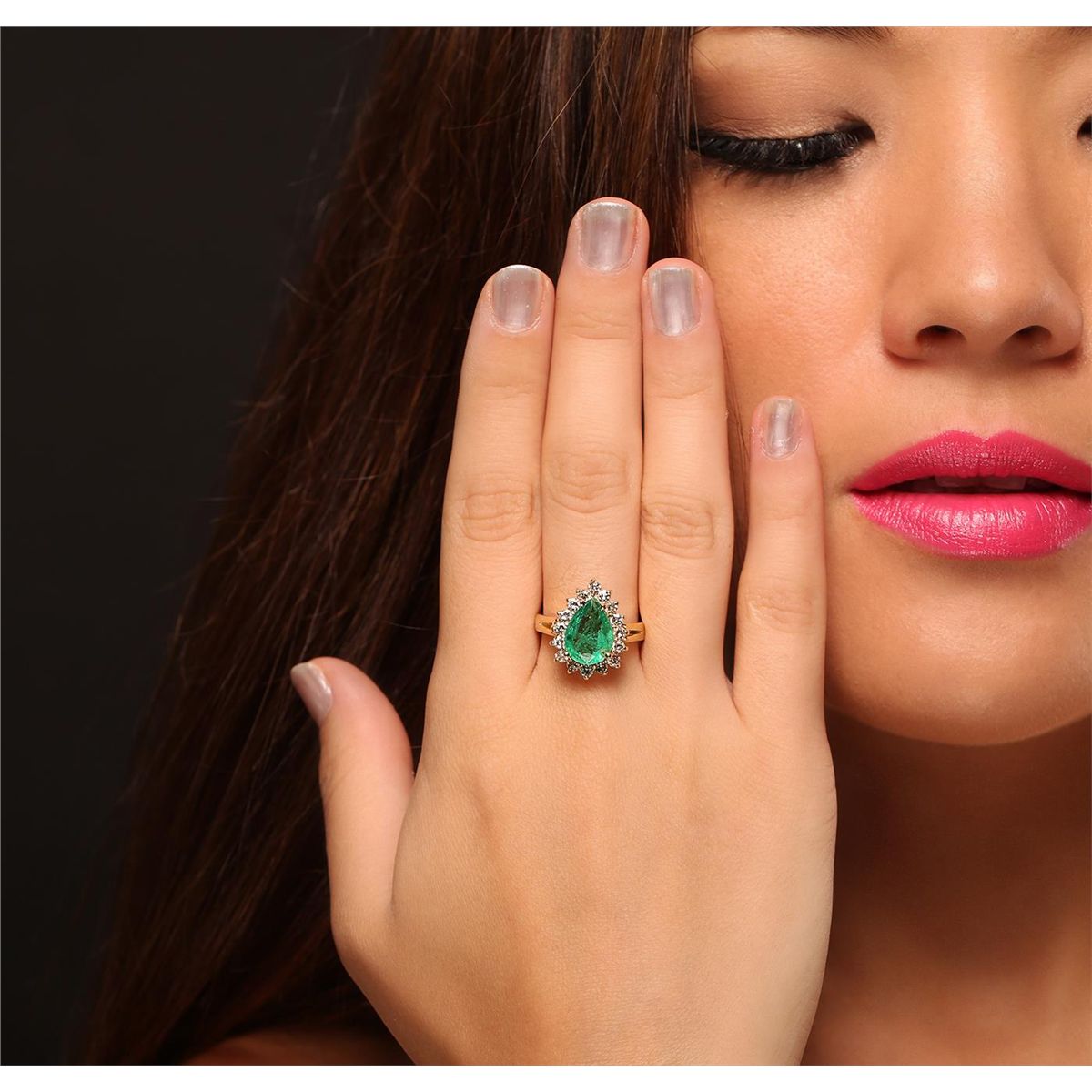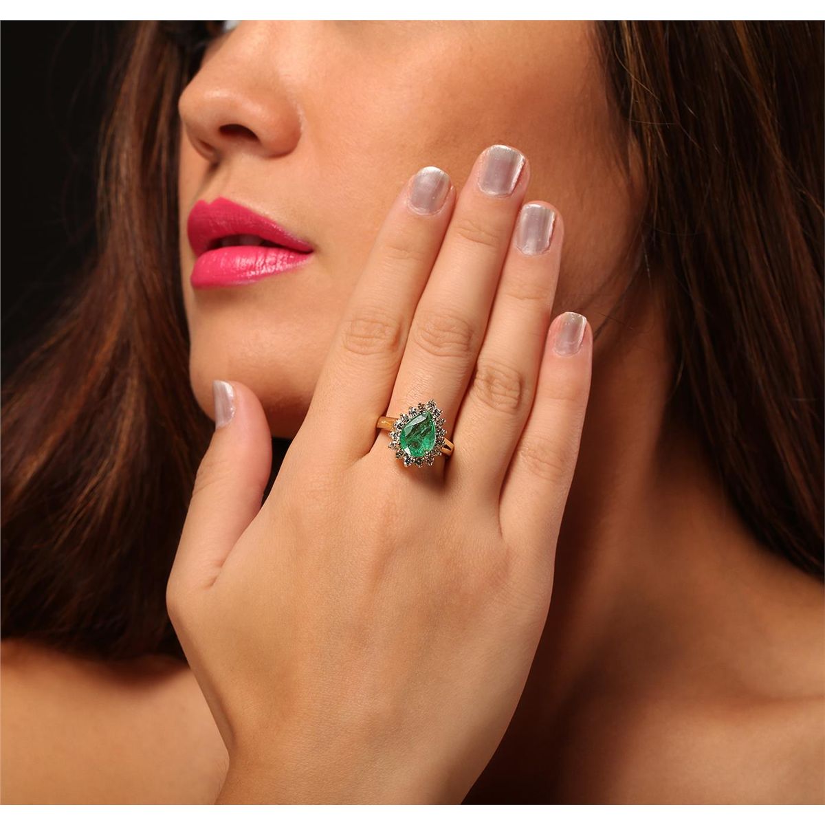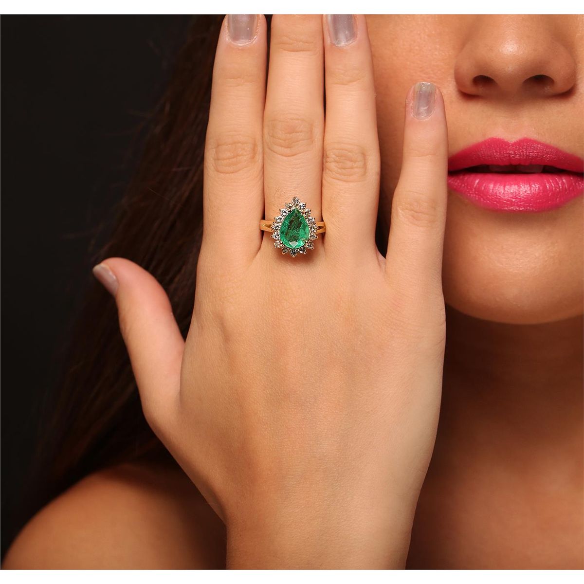One electronically tested 14KT yellow gold Ladies combination cast & assembled fashion ring with a high polish finish. Condition is new. Identified with markings of "14K". Containing: One prong set pear modified mixed cut natural emerald, measuring 11.70 x 9.00 x 5.00mm, approximate weight of 2.86ct., clarity is moderately included, type III, medium light, moderately strong, very slightly bluish green color, (GIA vslbG 4/4), cut is good. Colored gemstones are presumed to have been subjected to commonly used and possible undetectable color/clarity enhancement processes. Sixteen prong set round brilliant cut diamonds, measuring 2.30 - 2.30 x 1.38mm (depth est.) approximate total weight of 16 Stones = 0.71ct. Clarity of SI-2 to I-1, Color of K - L, Cut is Good. Total Weight of Colored Stones 2.86ct. Total Weight of Diamonds 0.71ct. Total Weight of Ring 7.00 grams. GGL Appraised at $9,460.00.