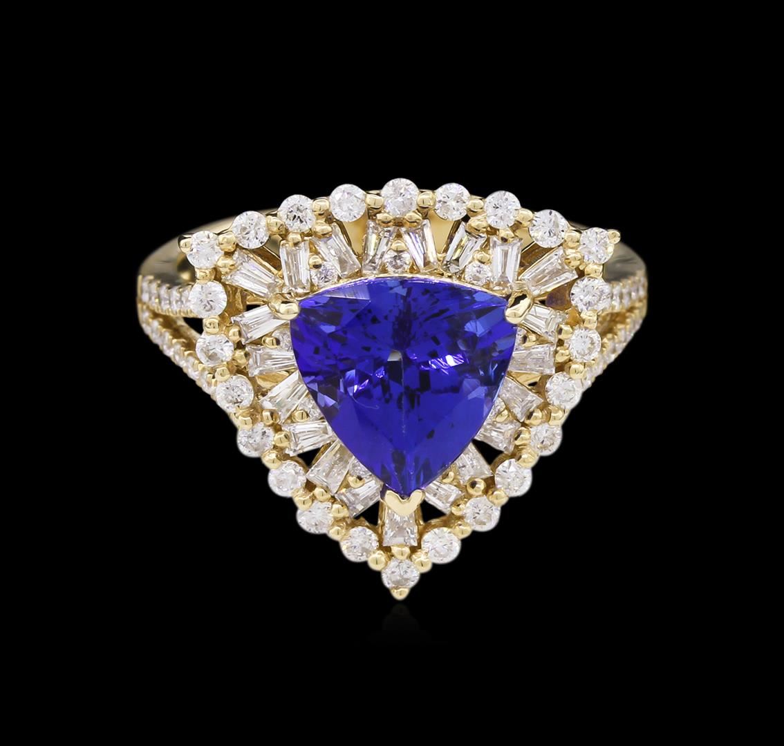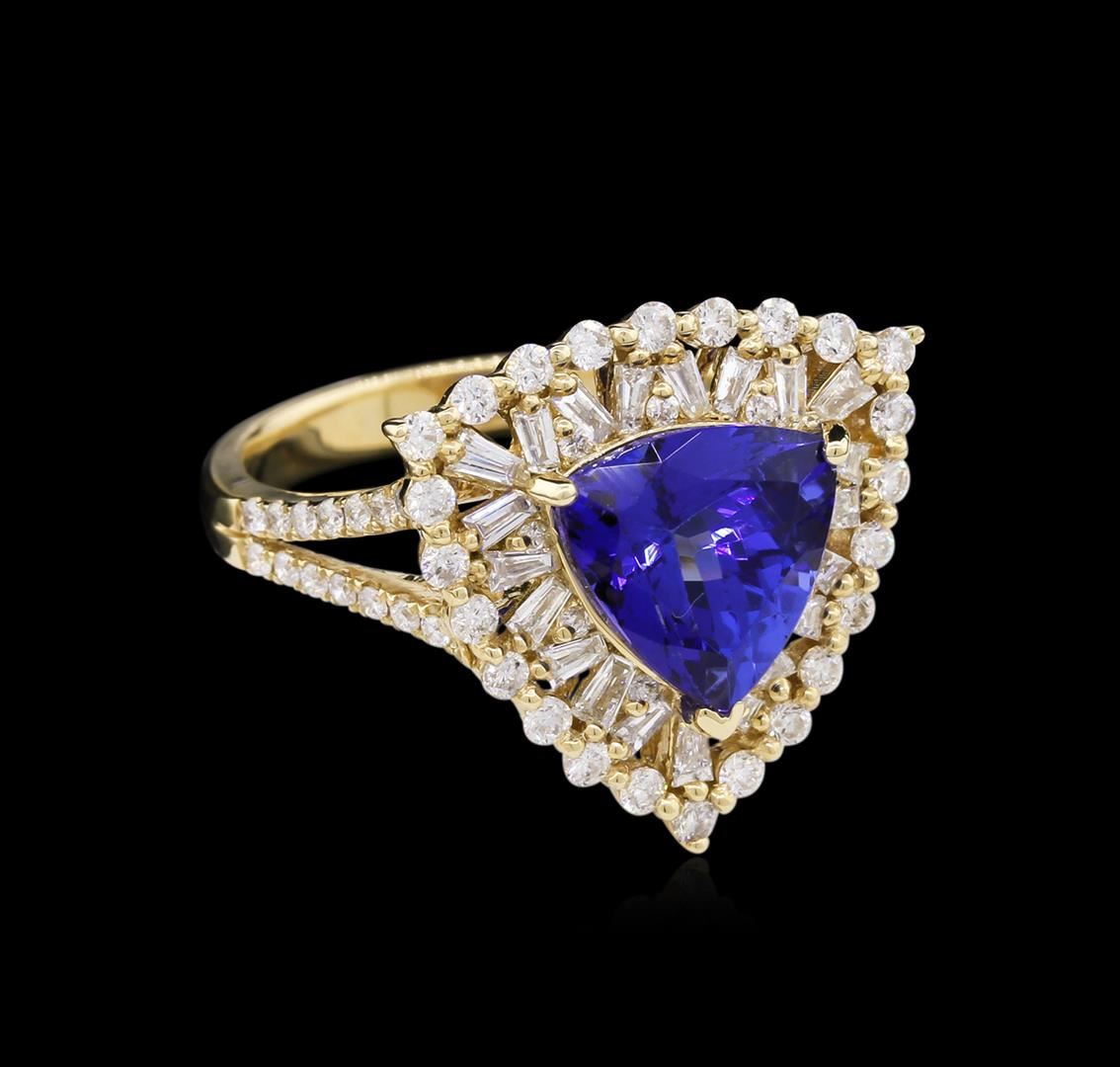 One electronically tested 14KT yellow gold Ladies combination cast & assembled ring with a bright polish finish. Identified with markings of "14K". Condition is new. Containing: Thirty-Seven prong set round brilliant cut diamonds, measuring 1.00 - 1.00 x 0.60mm (depth est.) approximate total weight of 37 Stones = 0.20ct. Clarity of I-1 to I-2, Color of H, Cut is Good. Twenty-Four prong set round brilliant cut diamonds, measuring 1.30 - 1.30 x 0.78mm (depth est.) approximate total weight of 24 Stones = 0.35ct. Clarity of I-1 to I-2, Color of H, Cut is Good. Nineteen prong set baguette cut diamonds, measuring 2.00 x 1.00 x 0.85mm (depth est.) approximate total weight of 19 Stones = 0.48ct. Clarity of SI-1 to SI-2, Color of J - K, Cut is Good. One prong set triangle modified brilliant cut natural tanzanite, measuring 9.00 x 9.00 x 5.85mm, approximate weight of 2.86ct., clarity is eye clean, type I, medium, moderately strong, blue color, (GIA B 5/4), cut is very good. Colored gemstones are presumed to have been subjected to commonly used color/clarity enhancement processes. Total Weight of Colored Stones 2.86ct. Total Weight of Diamonds 1.03ct. Total Weight of Ring 4.80 grams. GGL Appraised at $7,525.00.