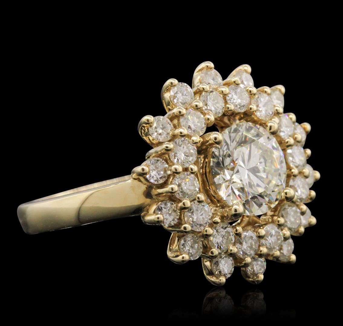 One electronically tested 14KT yellow gold Ladies combination cast & assembled engagement ring with a bright polish finish. Condition is new. Identified with markings of "14K". Containing: One prong set round brilliant cut diamond, measuring 7.28 - 7.26 x 4.49mm (depth est.) approximate. Total Weight of 1.51ct. Clarity: SI-2. Color: E, Cut is Good. Twenty-Eight prong set round brilliant cut diamonds, measuring 2.40 - 2.40 x 1.44mm (depth est.) approximate. Total Weight of 28 Stones = 1.35ct. Clarity: SI-3 to I-1. Color: H - I, Cut is Good. EGL USA GEM ID# US 911348435D. All diamonds are graded in the mounting, unless otherwise stated. Total Weight of Diamonds 2.86ct. Total Weight of Engagement Ring 6.30 grams. GGL Appraised at $51,795.00.