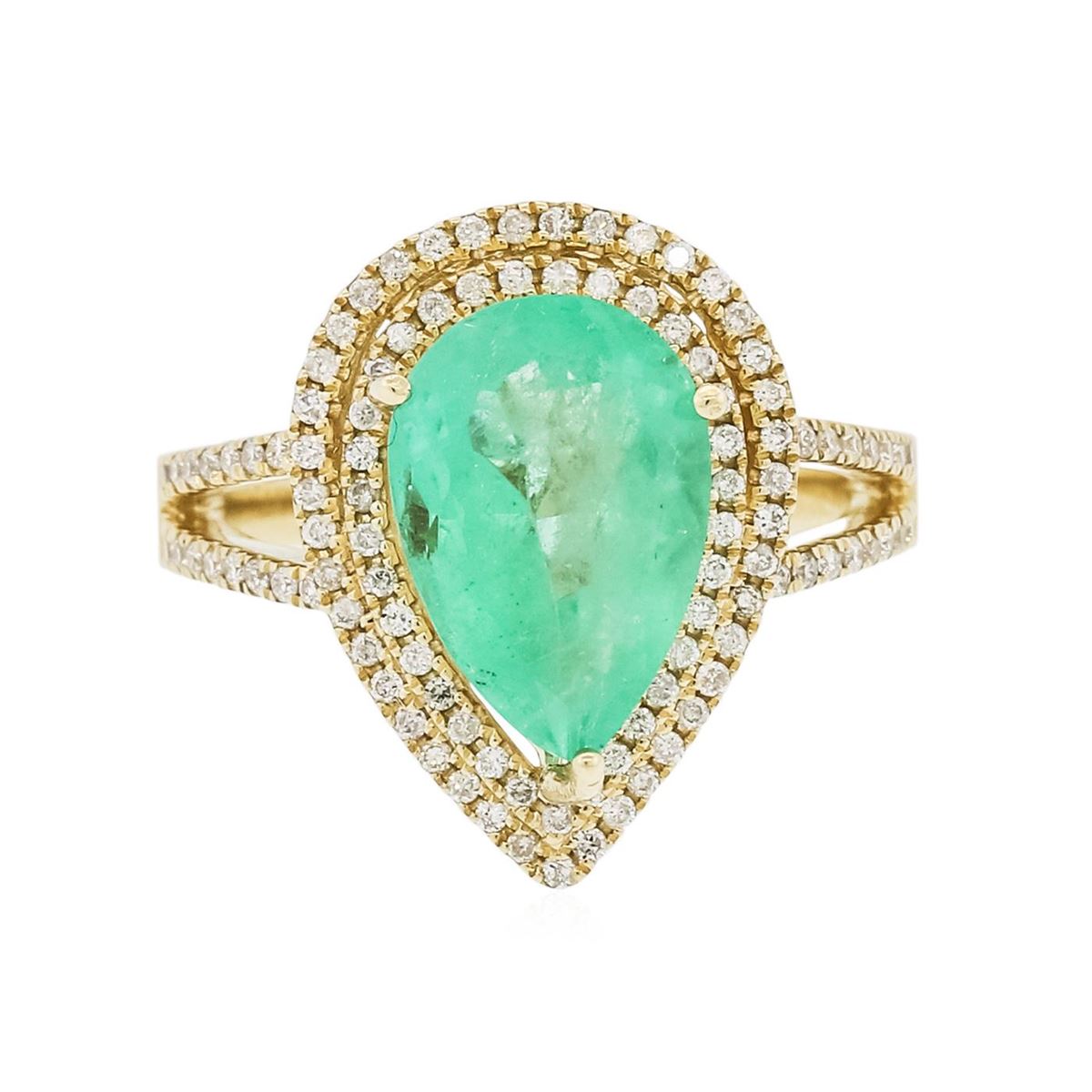 One electronically tested 14KT yellow gold ladies combination cast & assembled ring with a bright polish finish. Identified with markings of "14K". Condition is new. Containing: One prong set pear modified brilliant cut natural emerald, measuring 12.01 x 8.82 x 4.99mm, approximate weight of 2.88ct., clarity is heavily included, type III, medium light, very slightly grayish, very slightly bluish green color, (GIA vslbG 4/3), cut is good. One Hundred Four prong set round brilliant cut diamonds, measuring 1.10 - 1.10 x 0.66mm (depth est.) approximate total weight of 104 Stones = 0.50ct. Clarity: I-1 to I-2. Color: K - L, Cut is Good. Colored gemstones are presumed to have been subjected to commonly used enhancement processes. All diamonds and colored gemstones are graded in the mounting, unless otherwise stated. Total Weight of Colored Stones 2.88ct. Total Weight of Diamonds 0.50ct. Total Weight of Ring 6.40 grams. GGL Appraised at $8,300.00.