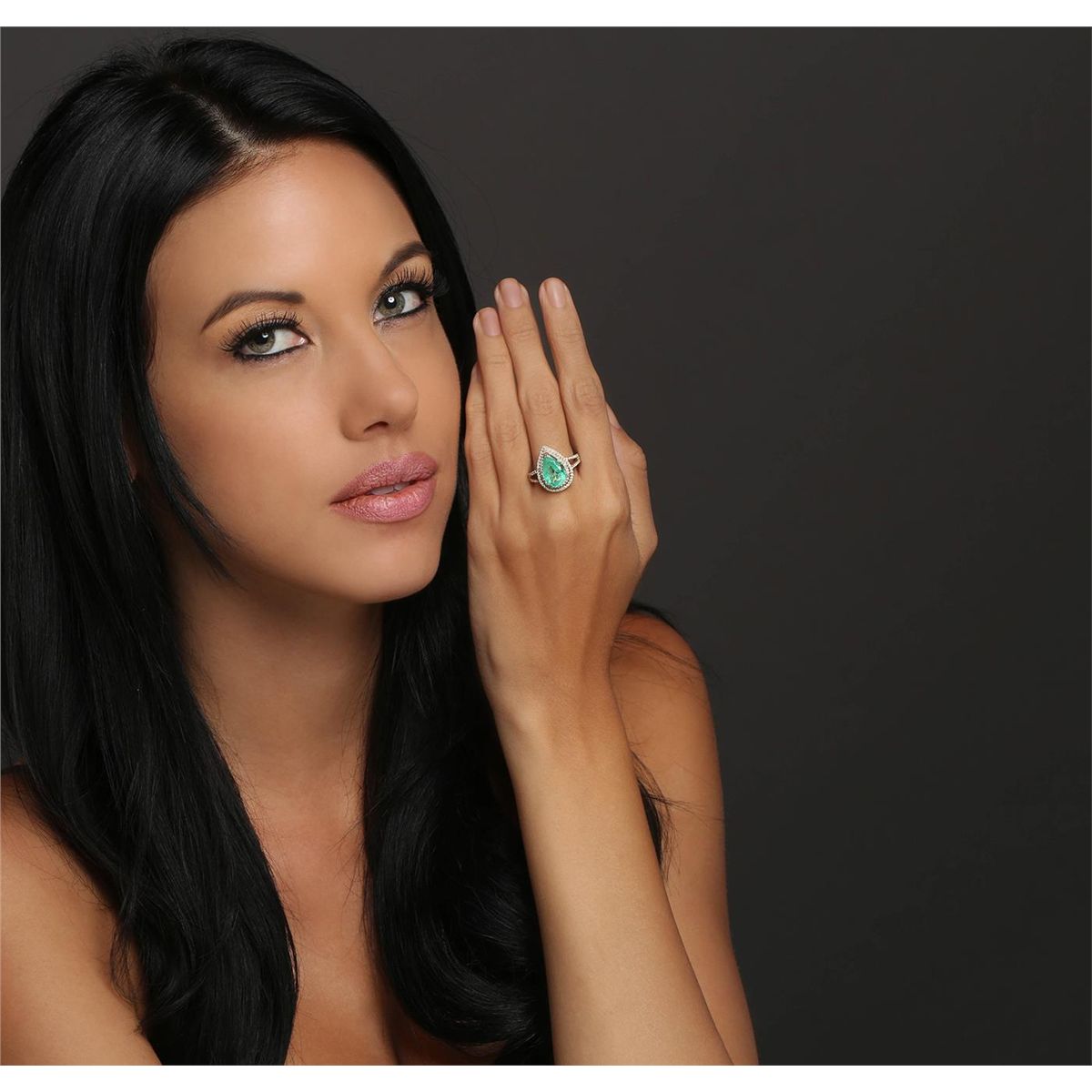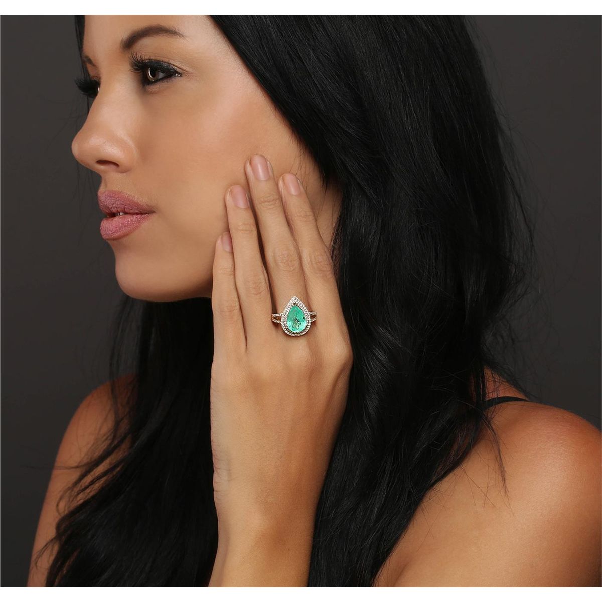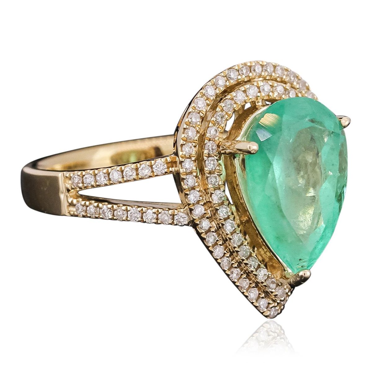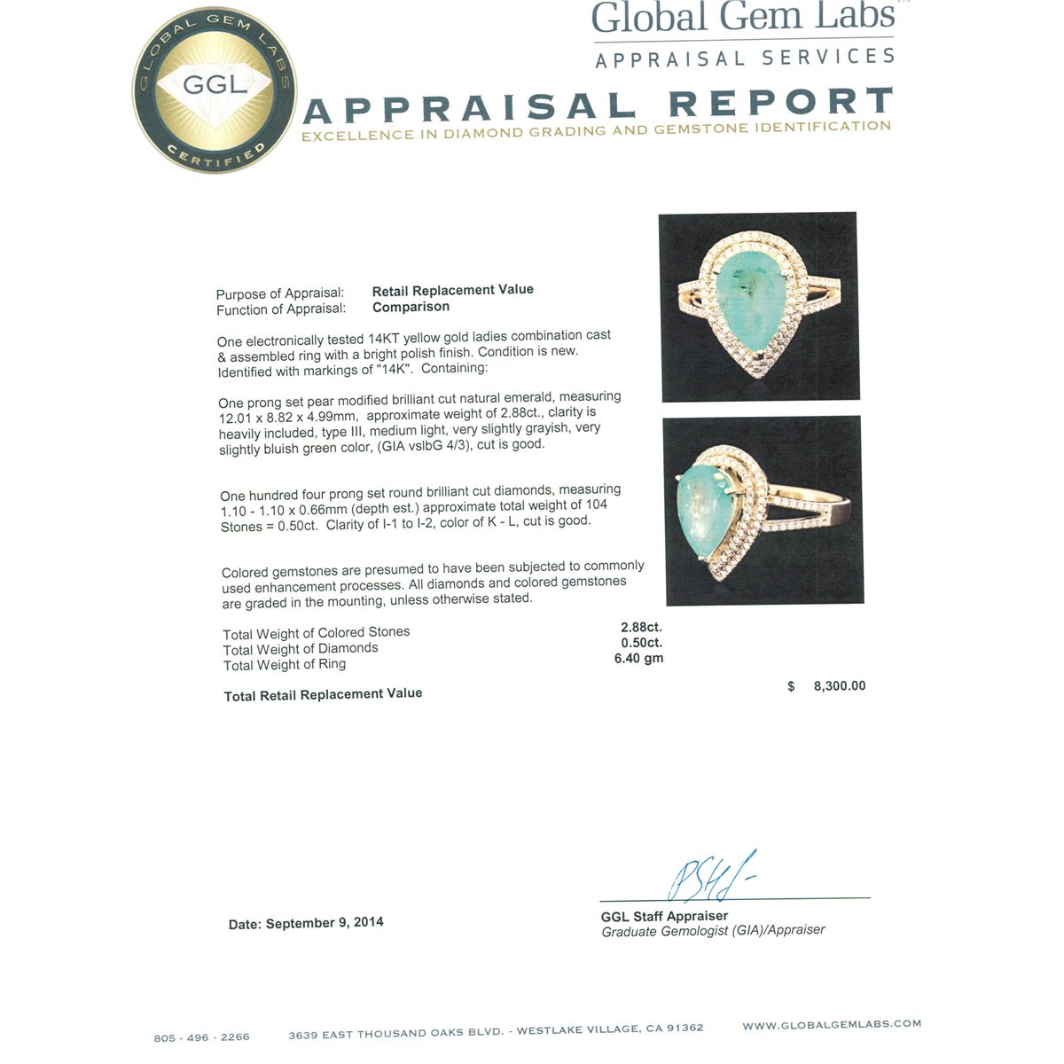 One electronically tested 14KT yellow gold ladies combination cast & assembled ring with a bright polish finish. Identified with markings of "14K". Condition is new. Containing: One prong set pear modified brilliant cut natural emerald, measuring 12.01 x 8.82 x 4.99mm, approximate weight of 2.88ct., clarity is heavily included, type III, medium light, very slightly grayish, very slightly bluish green color, (GIA vslbG 4/3), cut is good. One Hundred Four prong set round brilliant cut diamonds, measuring 1.10 - 1.10 x 0.66mm (depth est.) approximate total weight of 104 Stones = 0.50ct. Clarity: I-1 to I-2. Color: K - L, Cut is Good. Colored gemstones are presumed to have been subjected to commonly used enhancement processes. All diamonds and colored gemstones are graded in the mounting, unless otherwise stated. Total Weight of Colored Stones 2.88ct. Total Weight of Diamonds 0.50ct. Total Weight of Ring 6.40 grams. GGL Appraised at $8,300.00.