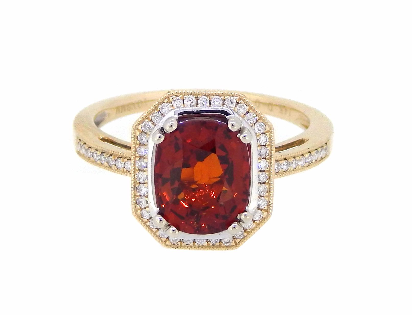 One 14KT Yellow Gold 2.91ct Garnet and Diamond Ring. (1) Spessartite Garnet with a total weight of 2.91cts. (50) Diamonds with a total weight of 0.14cts with a color of F-G and clarity of SI-1. Total weight of this ring is 4.3 grams.