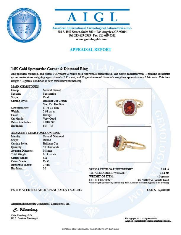 One 14KT Yellow Gold 2.91ct Garnet and Diamond Ring. (1) Spessartite Garnet with a total weight of 2.91cts. (50) Diamonds with a total weight of 0.14cts with a color of F-G and clarity of SI-1. Total weight of this ring is 4.3 grams.