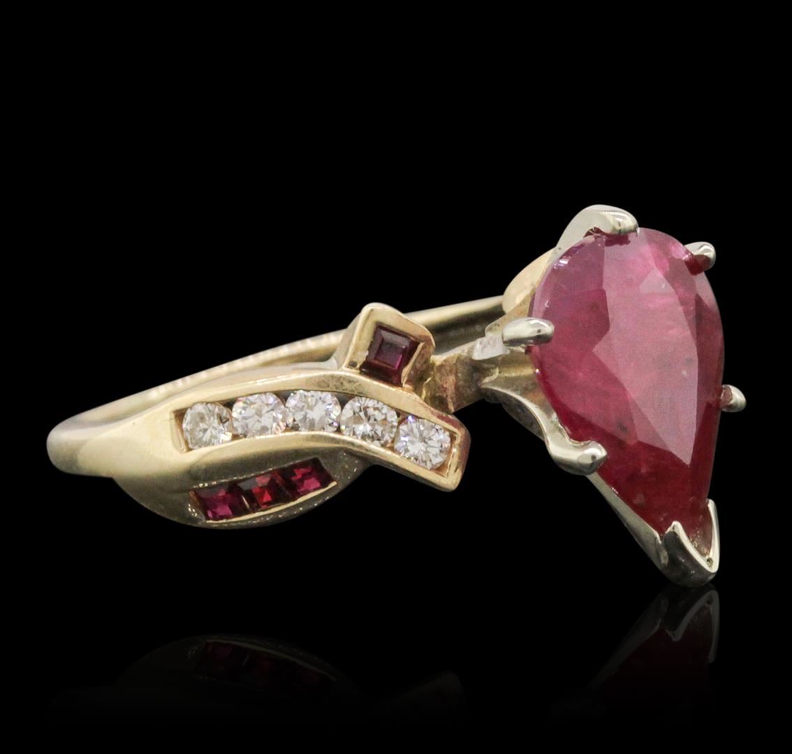 One ring featuring: 14KT Yellow Gold with a total weight of 3.60 grams, diamonds with a total weight of 0.20ctw, rubies with a total weight of 0.20ctw, and one center ruby with a total weight of 2.75ct.
