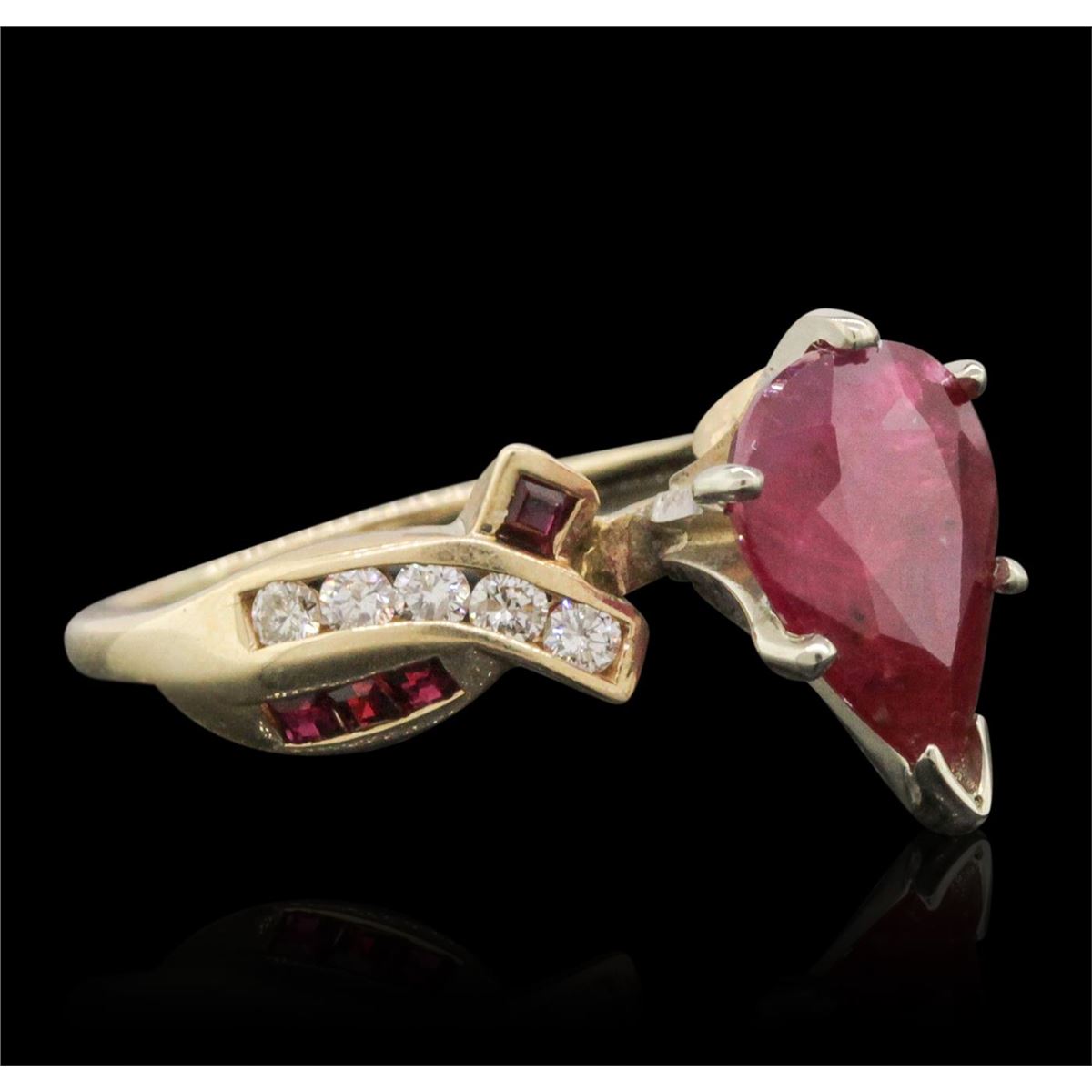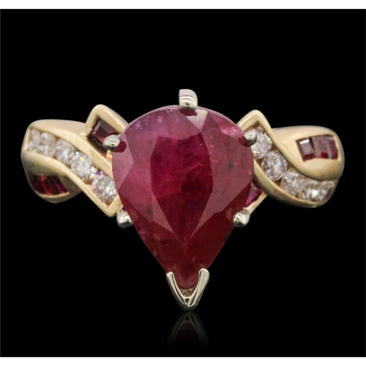 One ring featuring: 14KT Yellow Gold with a total weight of 3.60 grams, diamonds with a total weight of 0.20ctw, rubies with a total weight of 0.20ctw, and one center ruby with a total weight of 2.75ct.
