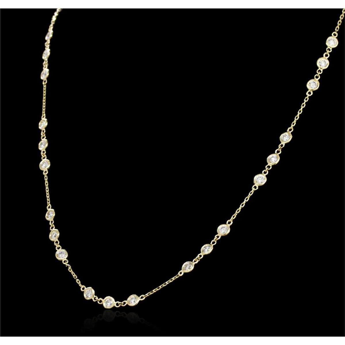 One electronically tested 14KT yellow gold ladies cast diamond necklace with a lobster claw clasp with a bright polish finish. Measurements: 16" in length Identified with markings of "K14". Condition is new. Containing: Thirty bezel set round brilliant cut diamonds, measuring 3.00 - 3.00 x 1.80mm (depth est.) approximate total weight of 30 Stones = 2.96ct. Clarity: SI-1 to SI-2. Color: I - J, Cut is Good. All diamonds are graded in the mounting, unless otherwise stated. Total Weight of Diamonds 2.96ct. Total Weight of Necklace 5.70 grams. GGL Appraised at $7,325.00.