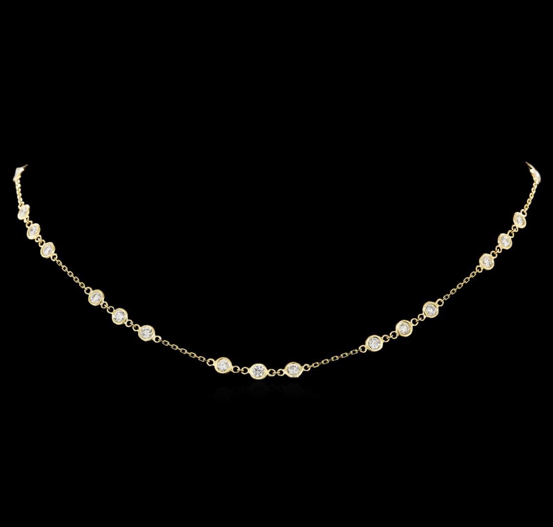 One electronically tested 14KT yellow gold ladies cast diamond necklace with a lobster claw clasp with a bright polish finish. Measurements: 16" in length Identified with markings of "K14". Condition is new. Containing: Thirty bezel set round brilliant cut diamonds, measuring 3.00 - 3.00 x 1.80mm (depth est.) approximate total weight of 30 Stones = 2.96ct. Clarity: SI-1 to SI-2. Color: I - J, Cut is Good. All diamonds are graded in the mounting, unless otherwise stated. Total Weight of Diamonds 2.96ct. Total Weight of Necklace 5.70 grams. GGL Appraised at $7,325.00.
