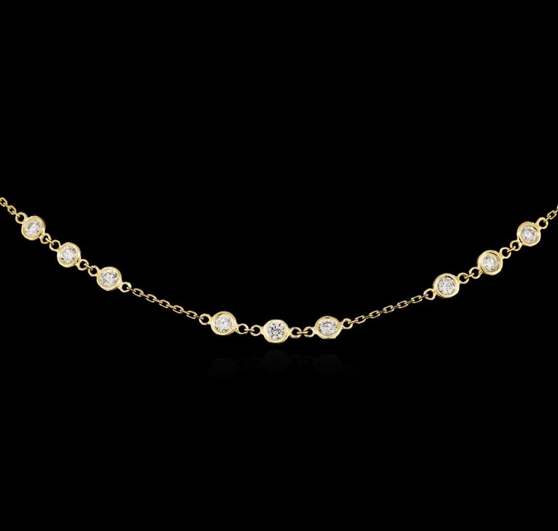 One electronically tested 14KT yellow gold ladies cast diamond necklace with a lobster claw clasp with a bright polish finish. Measurements: 16" in length Identified with markings of "K14". Condition is new. Containing: Thirty bezel set round brilliant cut diamonds, measuring 3.00 - 3.00 x 1.80mm (depth est.) approximate total weight of 30 Stones = 2.96ct. Clarity: SI-1 to SI-2. Color: I - J, Cut is Good. All diamonds are graded in the mounting, unless otherwise stated. Total Weight of Diamonds 2.96ct. Total Weight of Necklace 5.70 grams. GGL Appraised.