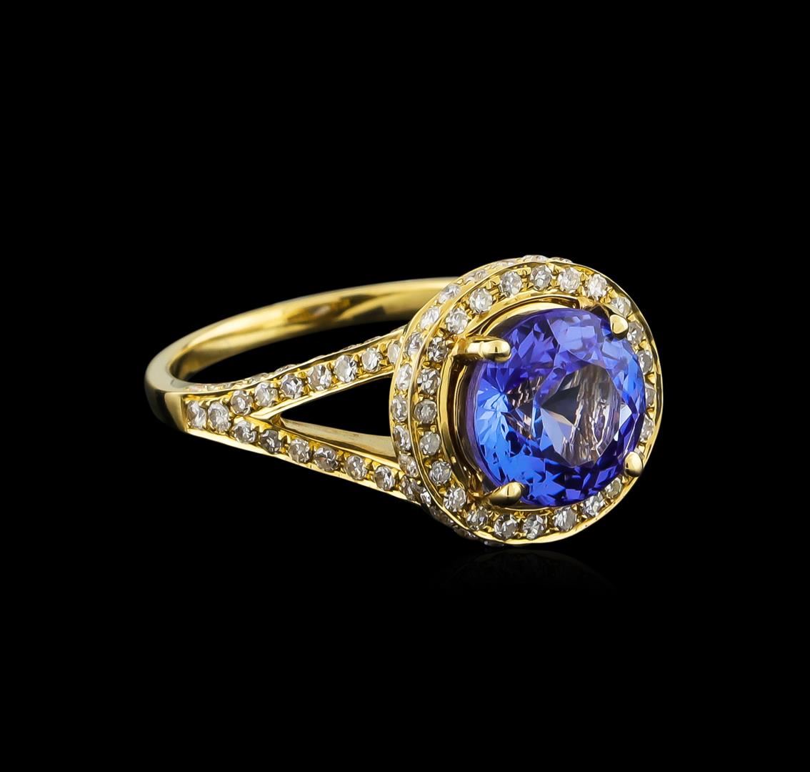 One electronically tested 14KT yellow gold ladies combination cast & assembled tanzanite and diamond ring with a split shank with a bright polish finish. Identified with markings of "14K". Condition is new. Containing: One prong set round modified brilliant cut natural tanzanite, measuring 8.80 - 8.76 x 5.71 mm, approximate weight of 2.96ct., clarity is eye clean, type I, medium light, very slightly grayish, violet color, (GIA V 4/3), cut is good. One Hundred Fifty-Three prong set single cut diamonds, measuring 1.00 - 1.00 x 0.60mm (depth est.) approximate total weight of 153 Stones = 0.55ct. Clarity: SI-1 to SI-2. Color: J, Cut is Good. Colored gemstones are presumed to have been subjected to commonly used enhancement processes. All diamonds and colored gemstones are graded in the mounting, unless otherwise stated. Total Weight of Colored Stones 2.96ct. Total Weight of Diamonds 0.55ct. Total Weight of Ring 5.10 grams. GGL Appraised at $7,305.00.