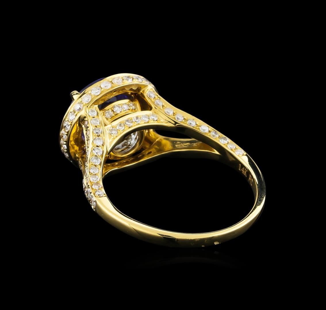 One electronically tested 14KT yellow gold ladies combination cast & assembled tanzanite and diamond ring with a split shank with a bright polish finish. Identified with markings of "14K". Condition is new. Containing: One prong set round modified brilliant cut natural tanzanite, measuring 8.80 - 8.76 x 5.71 mm, approximate weight of 2.96ct., clarity is eye clean, type I, medium light, very slightly grayish, violet color, (GIA V 4/3), cut is good. One Hundred Fifty-Three prong set single cut diamonds, measuring 1.00 - 1.00 x 0.60mm (depth est.) approximate total weight of 153 Stones = 0.55ct. Clarity: SI-1 to SI-2. Color: J, Cut is Good. Colored gemstones are presumed to have been subjected to commonly used enhancement processes. All diamonds and colored gemstones are graded in the mounting, unless otherwise stated. Total Weight of Colored Stones 2.96ct. Total Weight of Diamonds 0.55ct. Total Weight of Ring 5.10 grams. GGL Appraised at $7,305.00.