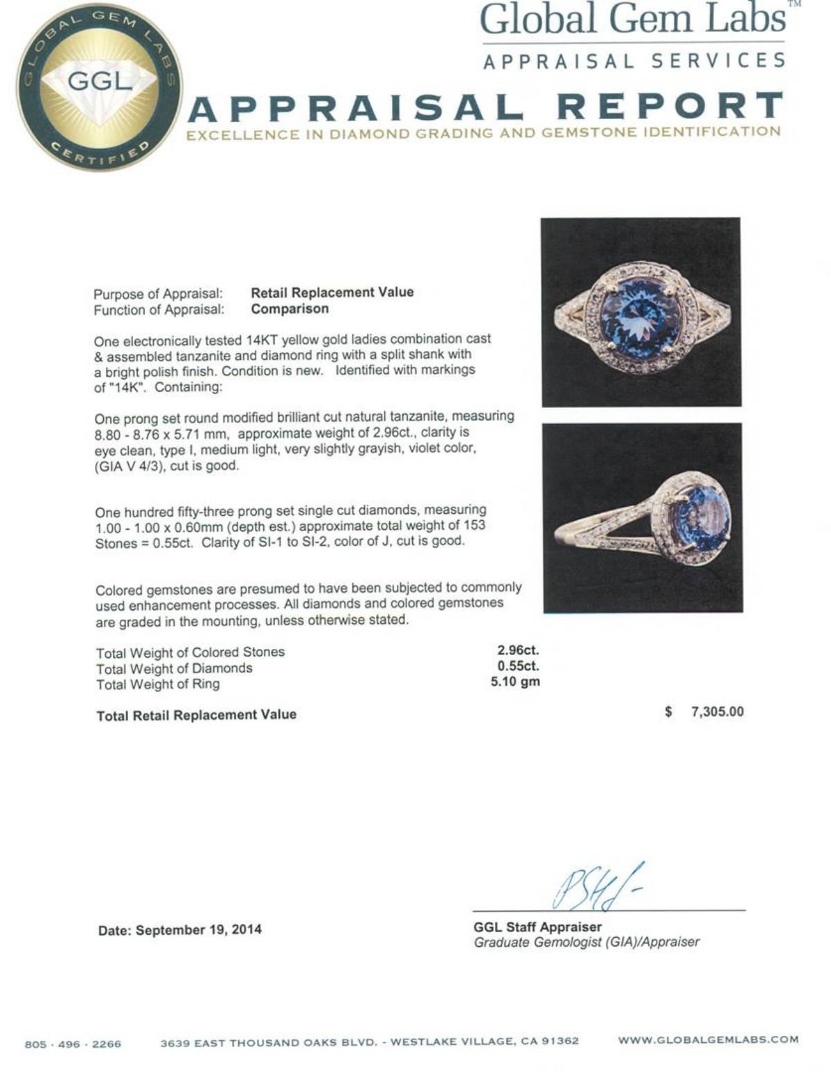 One electronically tested 14KT yellow gold ladies combination cast & assembled tanzanite and diamond ring with a split shank with a bright polish finish. Identified with markings of "14K". Condition is new. Containing: One prong set round modified brilliant cut natural tanzanite, measuring 8.80 - 8.76 x 5.71 mm, approximate weight of 2.96ct., clarity is eye clean, type I, medium light, very slightly grayish, violet color, (GIA V 4/3), cut is good. One Hundred Fifty-Three prong set single cut diamonds, measuring 1.00 - 1.00 x 0.60mm (depth est.) approximate total weight of 153 Stones = 0.55ct. Clarity: SI-1 to SI-2. Color: J, Cut is Good. Colored gemstones are presumed to have been subjected to commonly used enhancement processes. All diamonds and colored gemstones are graded in the mounting, unless otherwise stated. Total Weight of Colored Stones 2.96ct. Total Weight of Diamonds 0.55ct. Total Weight of Ring 5.10 grams. GGL Appraised.