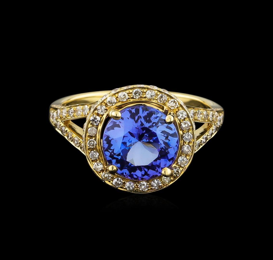 One electronically tested 14KT yellow gold ladies combination cast & assembled tanzanite and diamond ring with a split shank with a bright polish finish. Identified with markings of "14K". Condition is new. Containing: One prong set round modified brilliant cut natural tanzanite, measuring 8.80 - 8.76 x 5.71 mm, approximate weight of 2.96ct., clarity is eye clean, type I, medium light, very slightly grayish, violet color, (GIA V 4/3), cut is good. One Hundred Fifty-Three prong set single cut diamonds, measuring 1.00 - 1.00 x 0.60mm (depth est.) approximate total weight of 153 Stones = 0.55ct. Clarity: SI-1 to SI-2. Color: J, Cut is Good. Colored gemstones are presumed to have been subjected to commonly used enhancement processes. All diamonds and colored gemstones are graded in the mounting, unless otherwise stated. Total Weight of Colored Stones 2.96ct. Total Weight of Diamonds 0.55ct. Total Weight of Ring 5.10 grams. GGL Appraised.