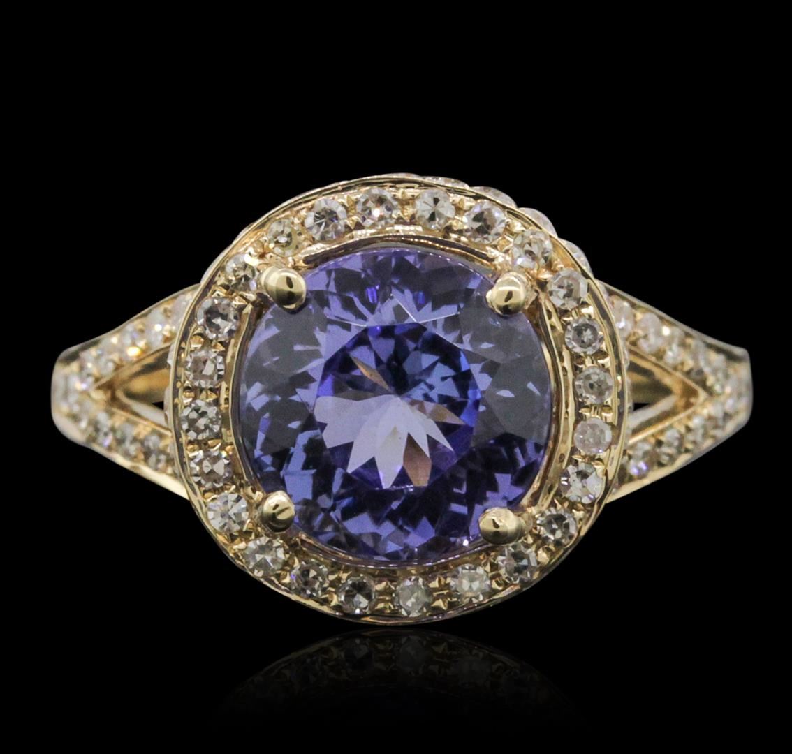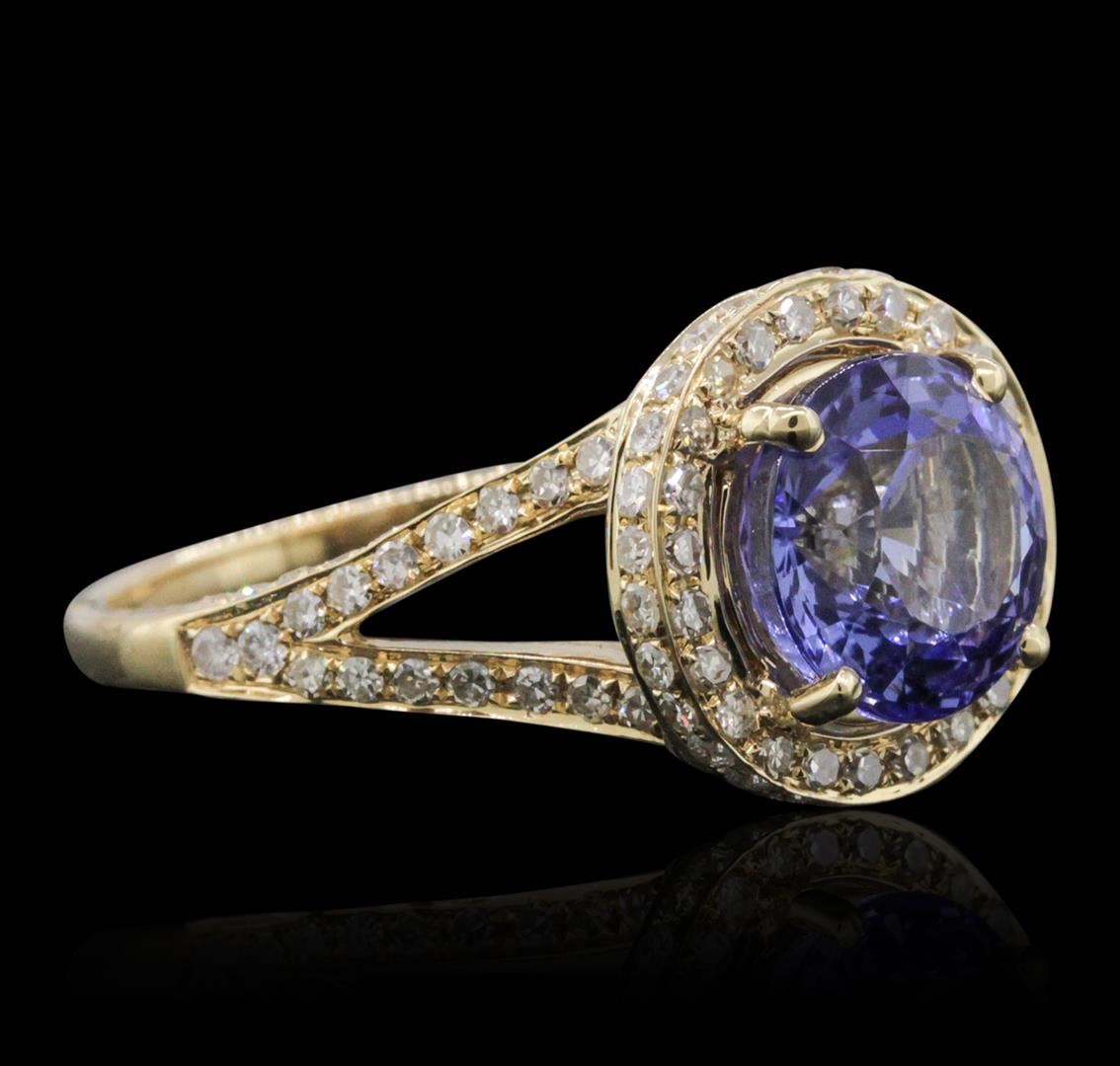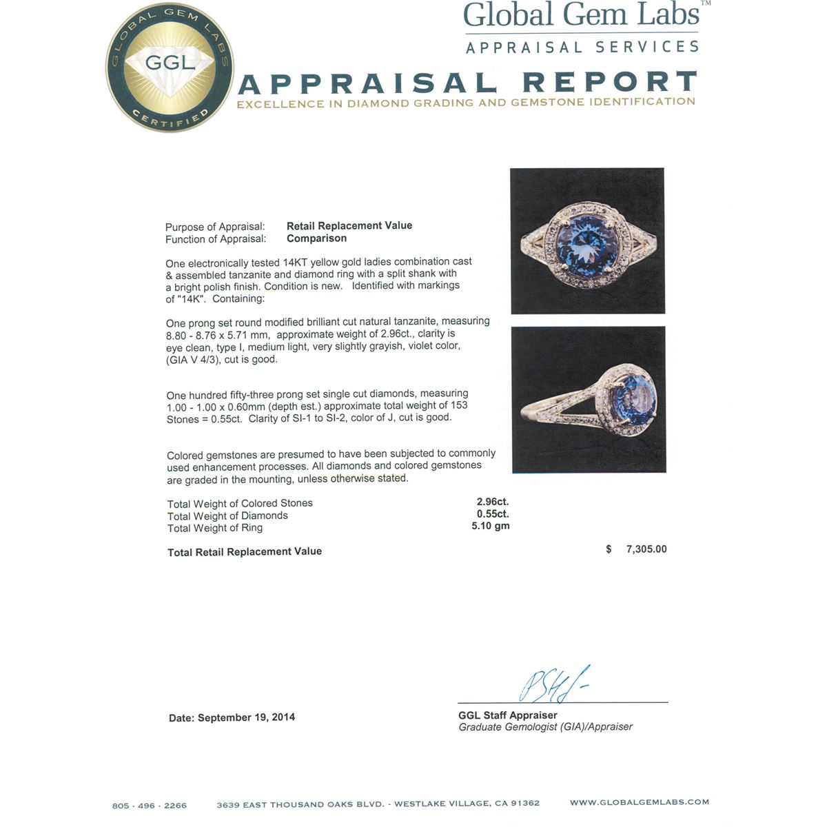 One electronically tested 14KT yellow gold ladies combination cast & assembled tanzanite and diamond ring with a split shank with a bright polish finish. Identified with markings of "14K". Condition is new. Containing: One prong set round modified brilliant cut natural tanzanite, measuring 8.80 - 8.76 x 5.71 mm, approximate weight of 2.96ct., clarity is eye clean, type I, medium light, very slightly grayish, violet color, (GIA V 4/3), cut is good. One Hundred Fifty-Three prong set single cut diamonds, measuring 1.00 - 1.00 x 0.60mm (depth est.) approximate total weight of 153 Stones = 0.55ct. Clarity: SI-1 to SI-2. Color: J, Cut is Good. Colored gemstones are presumed to have been subjected to commonly used enhancement processes. All diamonds and colored gemstones are graded in the mounting, unless otherwise stated. Total Weight of Colored Stones 2.96ct. Total Weight of Diamonds 0.55ct. Total Weight of Ring 5.10 grams. GGL Appraised at $7,305.00.