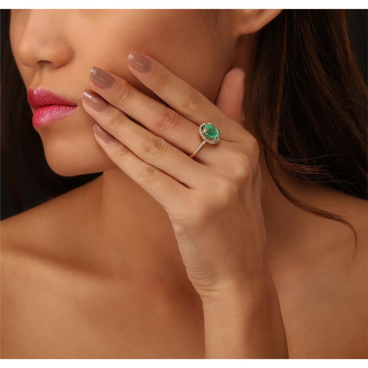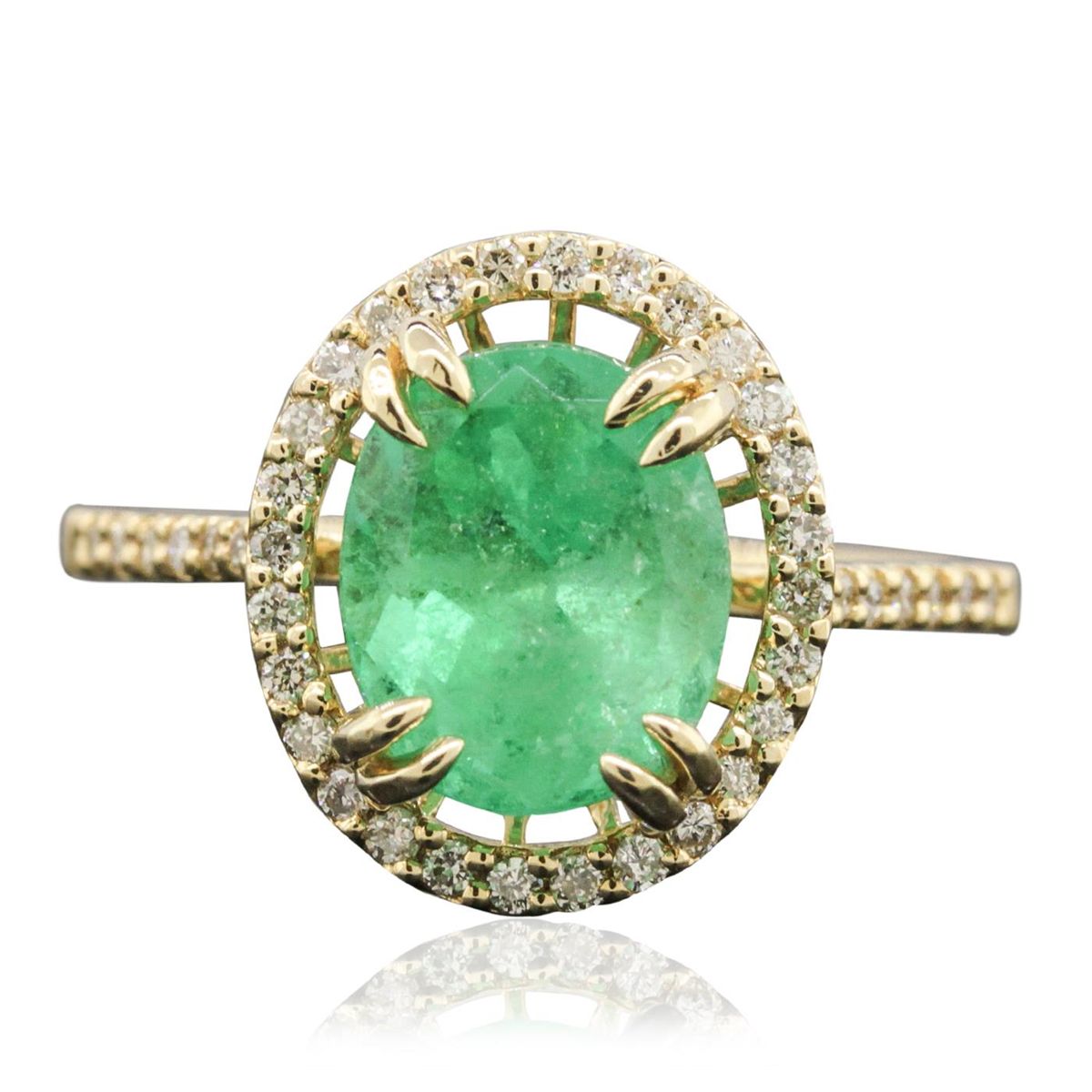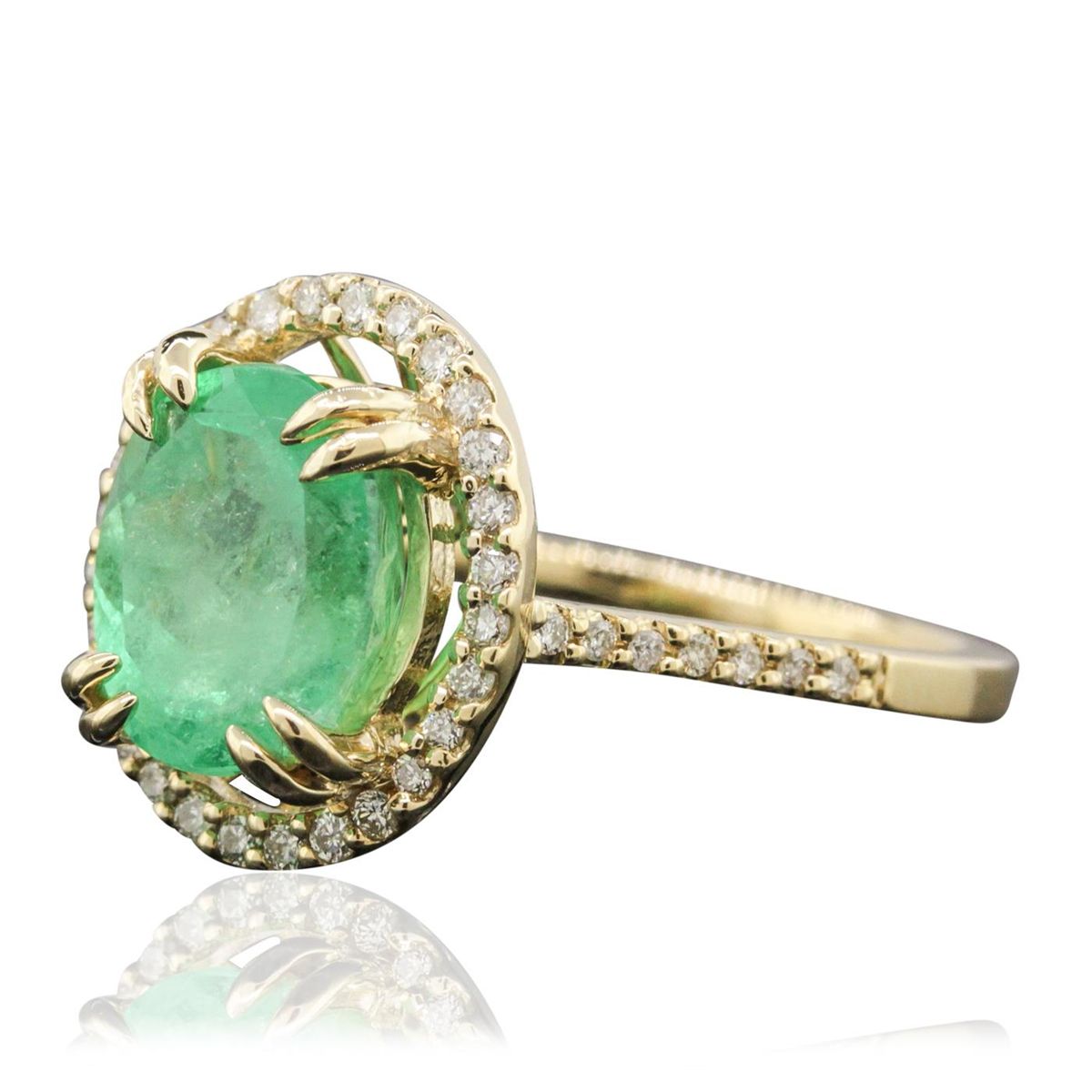 One electronically tested 14KT yellow gold ladies cast emerald and diamond ring with a bright polish finish. The featured emerald is set within a diamond bezel supported by diamond set shoulders, completed by a one and one-half millimeter wide band. Trademark is PMI. Identified with markings of "14K". Condition is new, good workmanship. Containing: One prong set oval mixed cut natural emerald, measuring 9.25 x 7.75 x 7.00mm, 8%. bulge factor, approximate weight of 2.97ct., clarity is heavily included, type III, medium, moderately strong, green color, (GIA G 5/4), cut is good. Transmitting light with a minimum of distortion, transparent. Naturally occurring internal & external characteristics are present. Indications of oil residue. Graded in the setting. Forty-Two prong set round brilliant cut diamonds, measuring 1.20 - 1.10 x 0.69mm (depth est.) approximate total weight of 42 Stones = 0.33ct. Graded in the setting. Clarity: SI-1 to I-1. Color: G - I. Total Weight of Colored Stones 2.97ct. Total Weight of Diamonds 0.33ct. Total Weight of Ring 3.58 grams. AIG Appraised at $5,260.00.