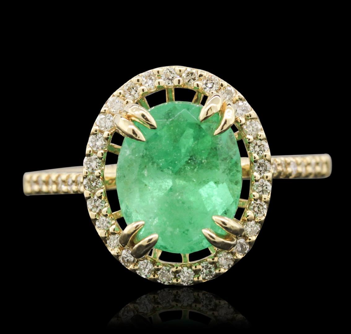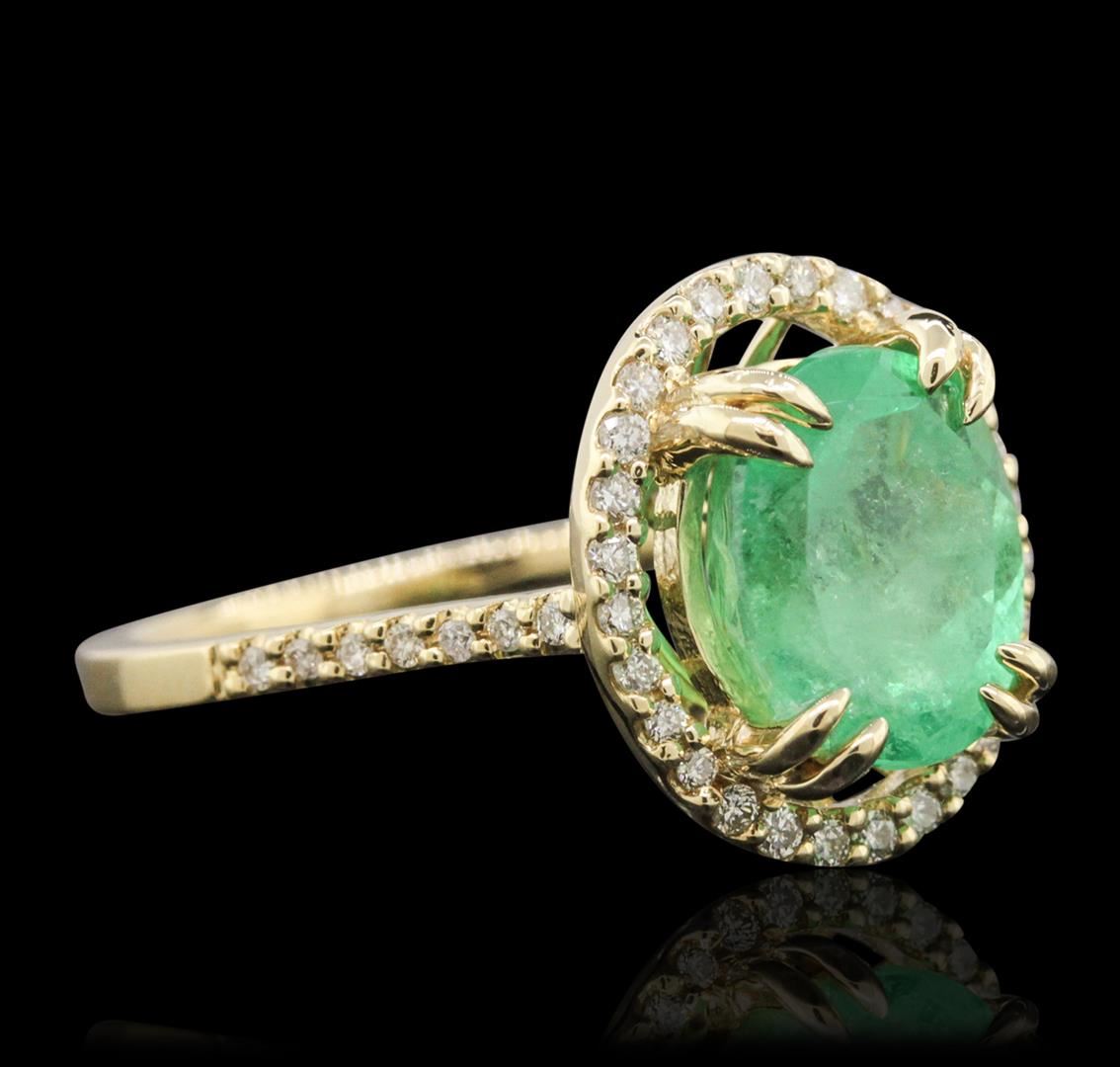 One electronically tested 14KT yellow gold ladies cast emerald and diamond ring with a bright polish finish. The featured emerald is set within a diamond bezel supported by diamond set shoulders, completed by a one and one-half millimeter wide band. Trademark is PMI. Identified with markings of "14K". Condition is new, good workmanship. Containing: One prong set oval mixed cut natural emerald, measuring 9.25 x 7.75 x 7.00mm, 8%. bulge factor, approximate weight of 2.97ct., clarity is heavily included, type III, medium, moderately strong, green color, (GIA G 5/4), cut is good. Transmitting light with a minimum of distortion, transparent. Naturally occurring internal & external characteristics are present. Indications of oil residue. Graded in the setting. Forty-Two prong set round brilliant cut diamonds, measuring 1.20 - 1.10 x 0.69mm (depth est.) approximate total weight of 42 Stones = 0.33ct. Graded in the setting. Clarity: SI-1 to I-1. Color: G - I. Total Weight of Colored Stones 2.97ct. Total Weight of Diamonds 0.33ct. Total Weight of Ring 3.58 grams. AIG Appraised at $5,260.00.