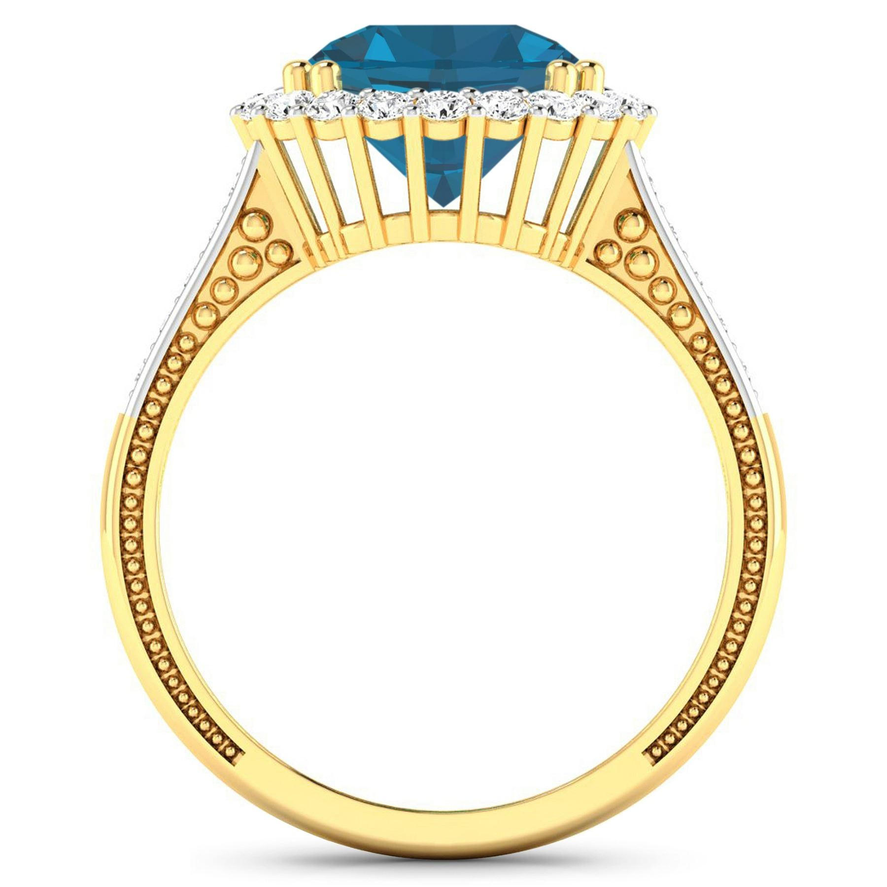 London Blue Topaz Round 9.00mm - 1Pc + White Diamond F/C Round 1.90mm - 4Pcs + White Diamond F/C Round 1.60mm - 16Pcs + White Diamond F/C Round 1.40mm - 10Pcs ( White Pan Rhodium ) ( SI-2/HI ) Total weight of gemstone is 2.9cts. Total Diamond weight is 0.54cts. Total weight of this ring is 4.17 grams. Ring size 7.