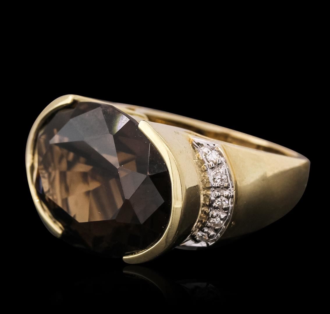 One electronically tested 14KT yellow gold ladies combination cast & assembled vintage ring with a bright polish finish. Identified with markings of "14K". Condition is very good. Containing: One half bezel set oval modified brilliant cut natural smoky quartz, measuring 24.00 x 15.00 x 10.57mm, approximate weight of 20.17ct., clarity is eye clean, medium, very slightly grayish, brown color, (GIA Br 5/3), cut is good. Ten prong set single cut diamonds, measuring 1.30 - 1.30 x 0.78mm (depth est.) approximate total weight of 10 Stones = 0.08ct. Clarity: SI-2. Color: J - K, Cut is Good. Colored gemstones are presumed to have been subjected to commonly used enhancement processes. All diamonds and colored gemstones are graded in the mounting, unless otherwise stated. Total Weight of Colored Stones 20.17ct. Total Weight of Diamonds 0.08ct. Total Weight of Ring 14.80 grams. GGL Appraised at $5,905.00.