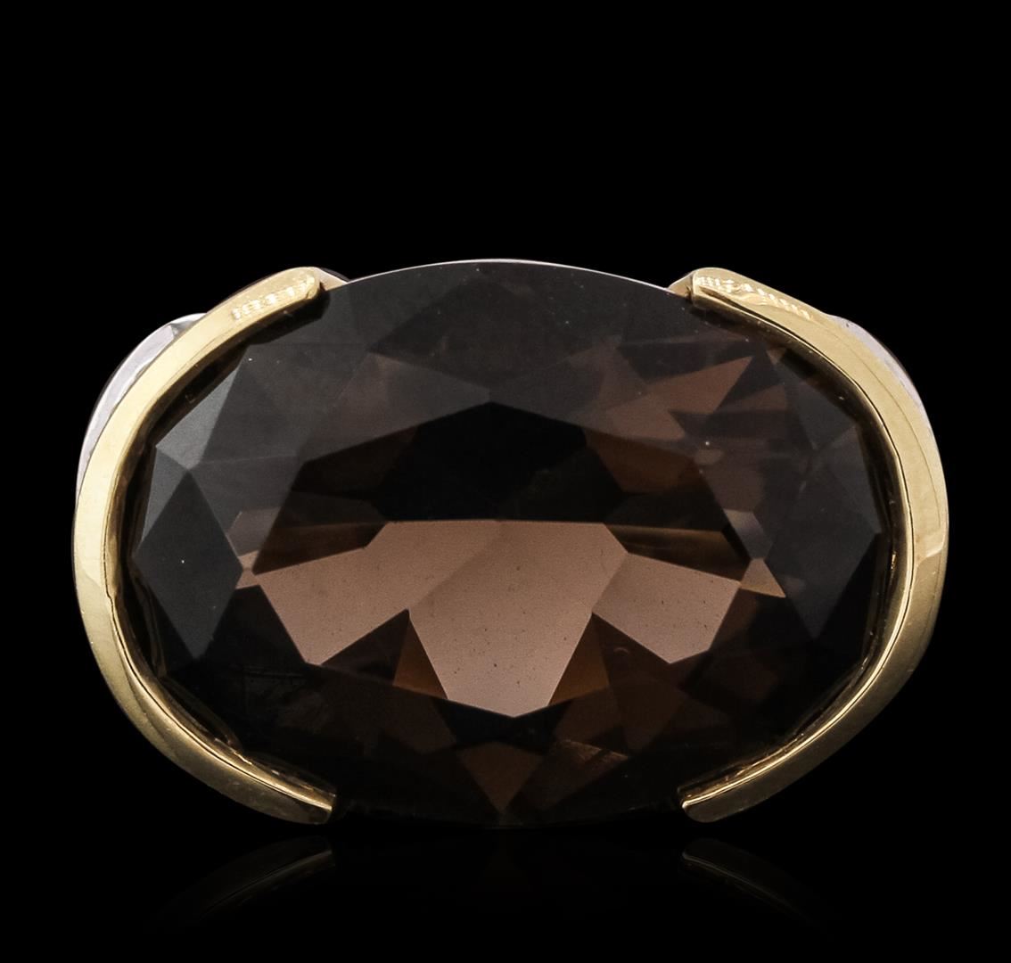 One electronically tested 14KT yellow gold ladies combination cast & assembled vintage ring with a bright polish finish. Identified with markings of "14K". Condition is very good. Containing: One half bezel set oval modified brilliant cut natural smoky quartz, measuring 24.00 x 15.00 x 10.57mm, approximate weight of 20.17ct., clarity is eye clean, medium, very slightly grayish, brown color, (GIA Br 5/3), cut is good. Ten prong set single cut diamonds, measuring 1.30 - 1.30 x 0.78mm (depth est.) approximate total weight of 10 Stones = 0.08ct. Clarity: SI-2. Color: J - K, Cut is Good. Colored gemstones are presumed to have been subjected to commonly used enhancement processes. All diamonds and colored gemstones are graded in the mounting, unless otherwise stated. Total Weight of Colored Stones 20.17ct. Total Weight of Diamonds 0.08ct. Total Weight of Ring 14.80 grams. GGL Appraised at $5,905.00.