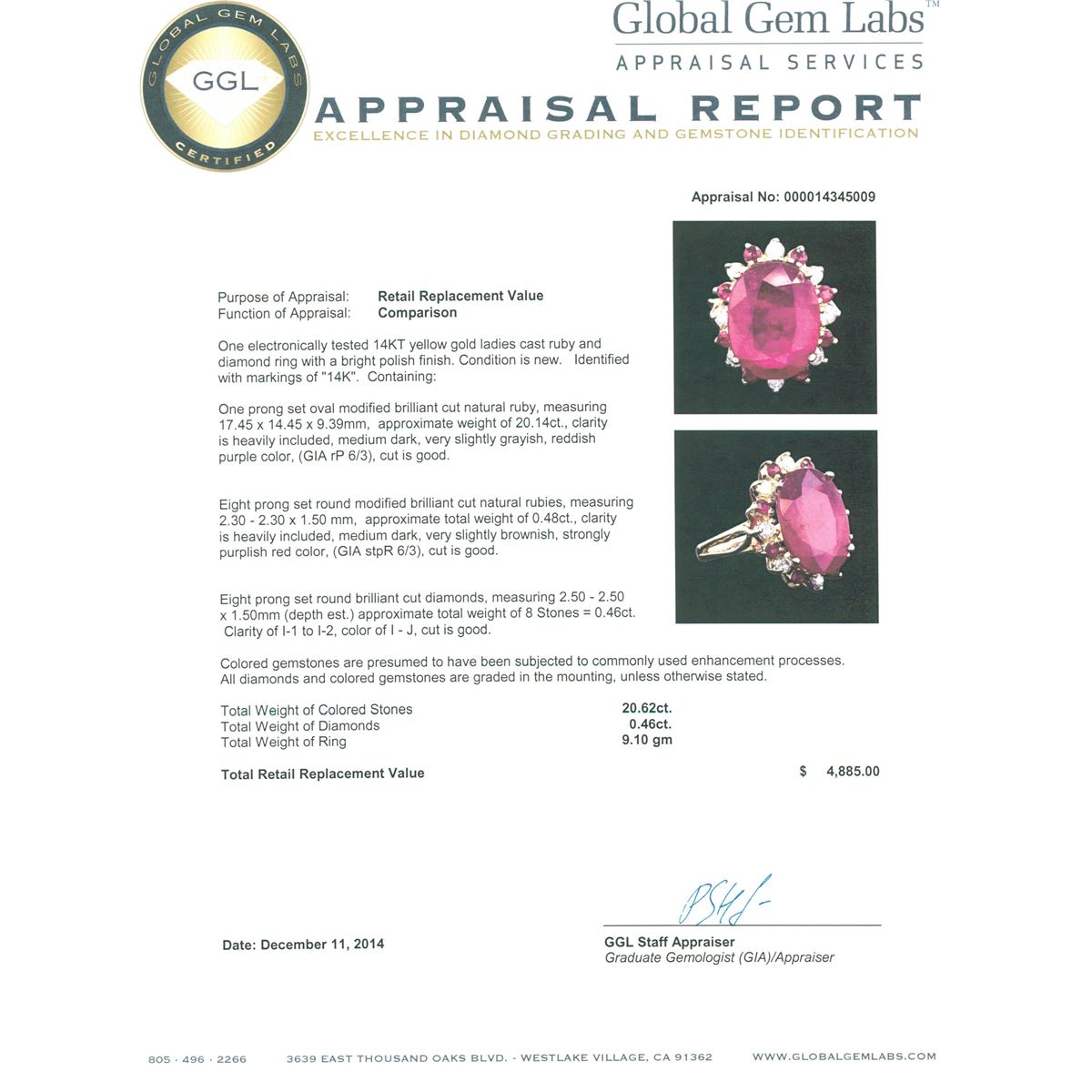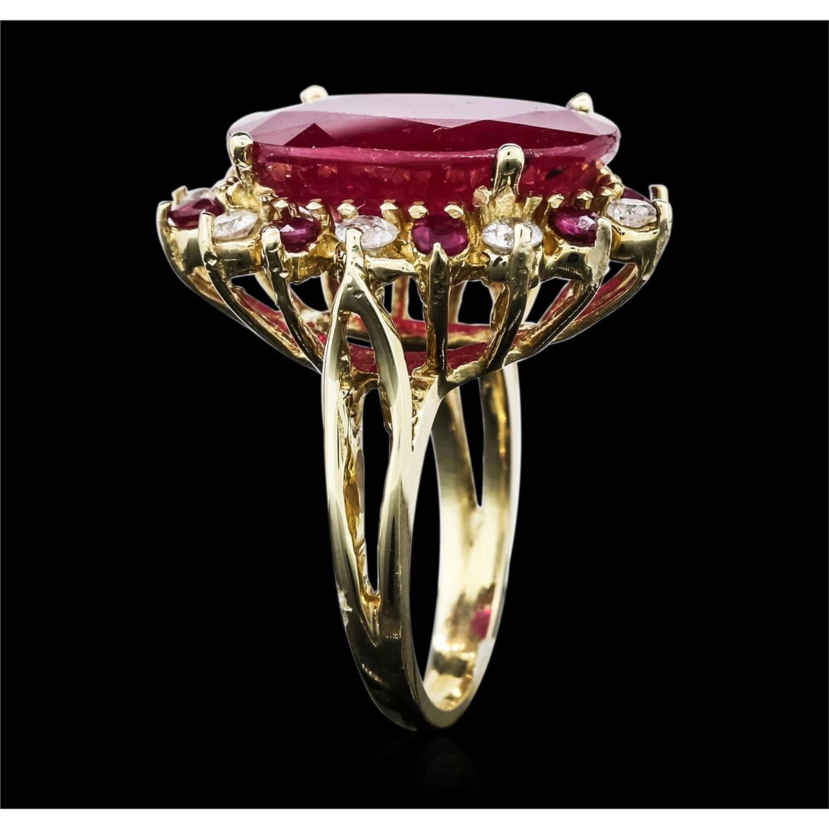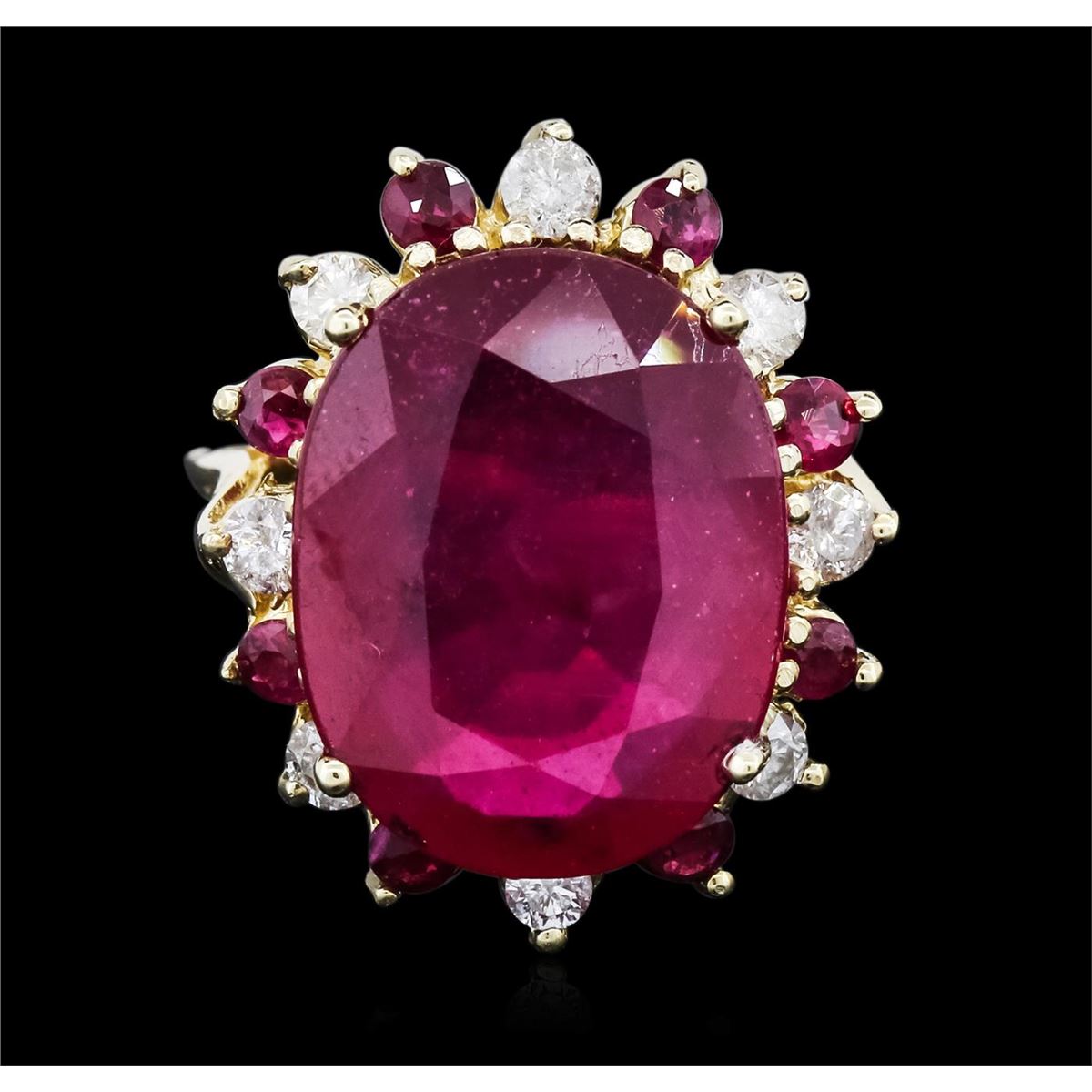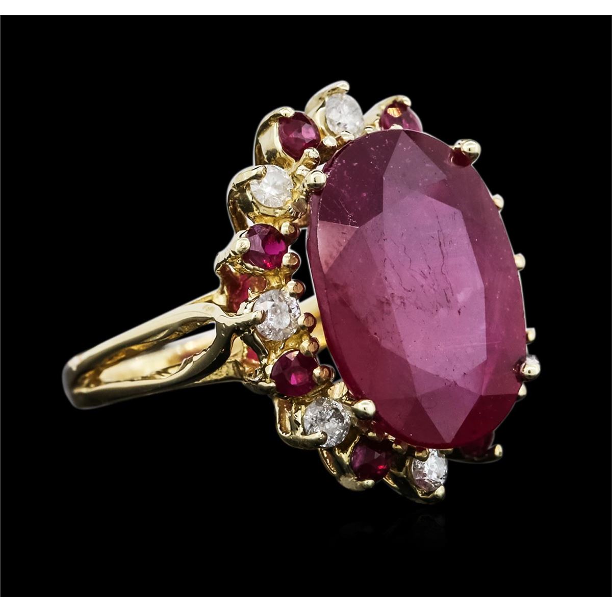 One electronically tested 14KT yellow gold ladies cast ruby and diamond ring with a bright polish finish. Identified with markings of "14K". Condition is new. Containing: One prong set oval modified brilliant cut natural ruby, measuring 17.45 x 14.45 x 9.39mm, approximate weight of 20.14ct., clarity is heavily included, medium dark, very slightly grayish, reddish purple color, (GIA rP 6/3), cut is good. Eight prong set round modified brilliant cut natural rubies, measuring 2.30 - 2.30 x 1.50 mm, approximate total weight of 0.48ct., clarity is heavily included, medium dark, very slightly brownish, strongly purplish red color, (GIA stpR 6/3), cut is good. Eight prong set round brilliant cut diamonds, measuring 2.50 - 2.50 x 1.50mm (depth est.) approximate total weight of 8 Stones = 0.46ct. Clarity: I-1 to I-2. Color: I - J, Cut is Good. Colored gemstones are presumed to have been subjected to commonly used enhancement processes. All diamonds and colored gemstones are graded in the mounting, unless otherwise stated. Total Weight of Colored Stones 20.62ct. Total Weight of Diamonds 0.46ct. Total Weight of Ring 9.10 grams. GGL Appraised at $4,885.00.