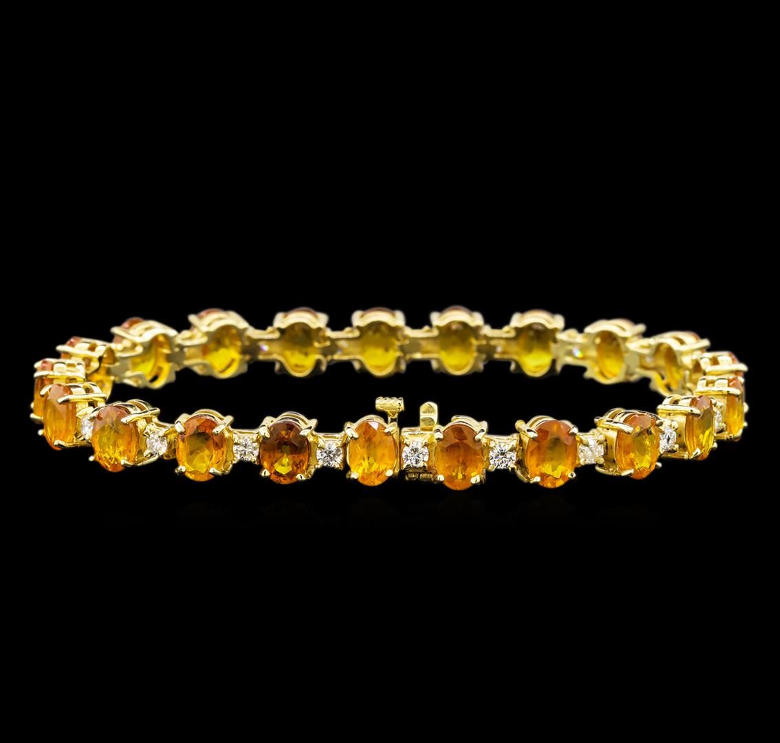 One electronically tested 14KT yellow gold ladies cast sapphire and diamond bracelet with a hidden box clasp with safety closer with a bright polish finish. Measurements: 7 inches in length. Identified with markings of "14K". Condition is new. Containing: Twenty-one prong set oval modified brilliant cut natural yellow sapphires, measuring 6.80 x 5.00. x 3.25mm, approximate total weight of 21.40ct., clarity is eye clean, medium light, brownish, yellow color, (GIA Y 4/3), cut is good. Twenty-One prong set round brilliant cut diamonds, measuring 2.50 - 2.50 x 1.50mm (depth est.) approximate total weight of 21 Stones = 1.20ct. Clarity: VS-2 to SI-1. Color: J, Cut is Good. Colored gemstones are presumed to have been subjected to commonly used enhancement processes. All diamonds and colored gemstones are graded in the mounting, unless otherwise stated. Total Weight of Colored Stones 21.40ct. Total Weight of Diamonds 1.20ct. Total Weight of Bracelet 19.60 grams. GGL Appraised at $5,570.00.