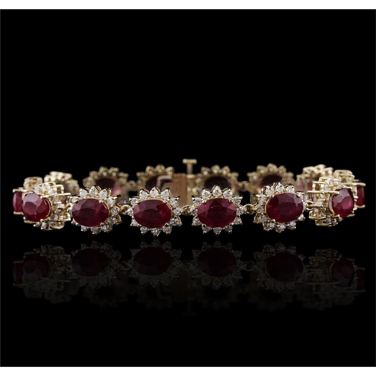 One electronically tested 14KT yellow gold ladies combination cast & assembled bracelet with a hidden box clasp with a bright polish finish. Condition is new. Identified with markings of "14K". Containing: Thirteen prong set oval modified brilliant cut natural rubies, measuring 8.00 x 6.00 x 4.20mm, approximate. Total Weight of 21.45ct., clarity is heavily included, type II, medium dark, moderately strong, strongly purplish red color, (GIA stpR 6/4), cut is good. One Hundred Sixty-Eight prong set round brilliant cut diamonds, measuring 1.50 - 1.50 x 0.90mm (depth est.) approximate. Total Weight of 168 Stones = 2.07ct. Clarity: I-1 to I-2. Color: J - K, Cut is Good. Colored gemstones are presumed to have been subjected to commonly used enhancement processes. All diamonds and colored gemstones are graded in the mounting, unless otherwise stated. Total Weight of Colored Stones 21.45ct. Total Weight of Diamonds 2.07ct. Total Weight of Bracelet 23.50 grams. GGL Appraised at $17,100.00.