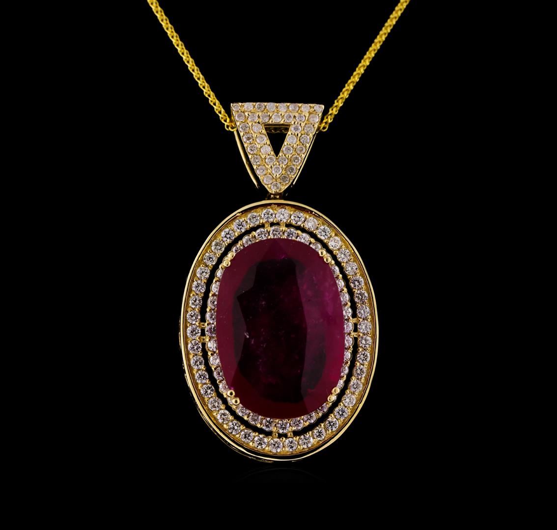 One electronically tested 14KT yellow gold ladies combination cast & assembled ruby and diamond pendant & chain 17.0" long, cable link with a lobster claw clasp with a bright polish finish. Identified with markings of "585". Condition is new. Containing: One prong set oval modified brilliant cut natural ruby, measuring 20.00 x 14.00 x 9.10mm, approximate weight of 21.67ct., clarity is heavily included, medium dark, moderately strong, strongly purplish red color, (GIA stpR 6/4), cut is good. One Hundred Twenty-Two prong set round brilliant cut diamonds, measuring 1.30 - 1.30 x 0.78mm (depth est.) approximate total weight of 122 Stones = 0.98ct. Clarity: SI-2 to I-1. Color: I - J, Cut is Good. Colored gemstones are presumed to have been subjected to commonly used enhancement processes. All diamonds and colored gemstones are graded in the mounting, unless otherwise stated. Total Weight of Colored Stones 21.67ct. Total Weight of Diamonds 0.98ct. Total Weight of Pendant & Chain 15.30 grams. GGL Appraised at $6,960.00.