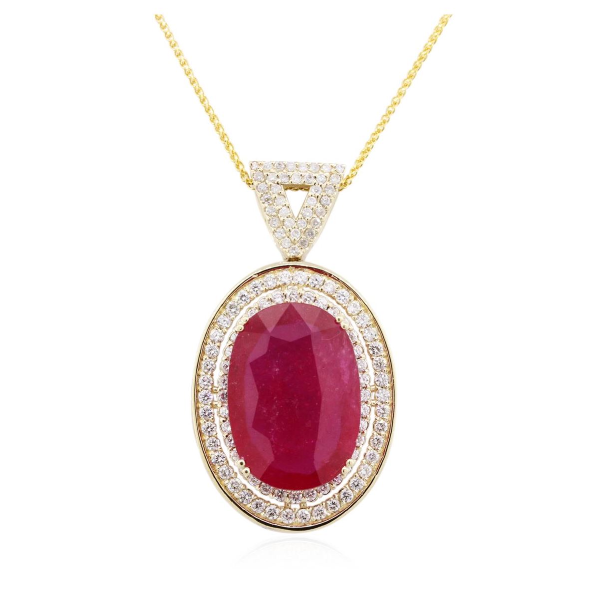 One electronically tested 14KT yellow gold ladies combination cast & assembled ruby and diamond pendant & chain 17.0" long, cable link with a lobster claw clasp with a bright polish finish. Identified with markings of "585". Condition is new. Containing: One prong set oval modified brilliant cut natural ruby, measuring 20.00 x 14.00 x 9.10mm, approximate weight of 21.67ct., clarity is heavily included, medium dark, moderately strong, strongly purplish red color, (GIA stpR 6/4), cut is good. One Hundred Twenty-Two prong set round brilliant cut diamonds, measuring 1.30 - 1.30 x 0.78mm (depth est.) approximate total weight of 122 Stones = 0.98ct. Clarity: SI-2 to I-1. Color: I - J, Cut is Good. Colored gemstones are presumed to have been subjected to commonly used enhancement processes. All diamonds and colored gemstones are graded in the mounting, unless otherwise stated. Total Weight of Colored Stones 21.67ct. Total Weight of Diamonds 0.98ct. Total Weight of Pendant & Chain 15.30 grams. GGL Appraised at $6,960.00.